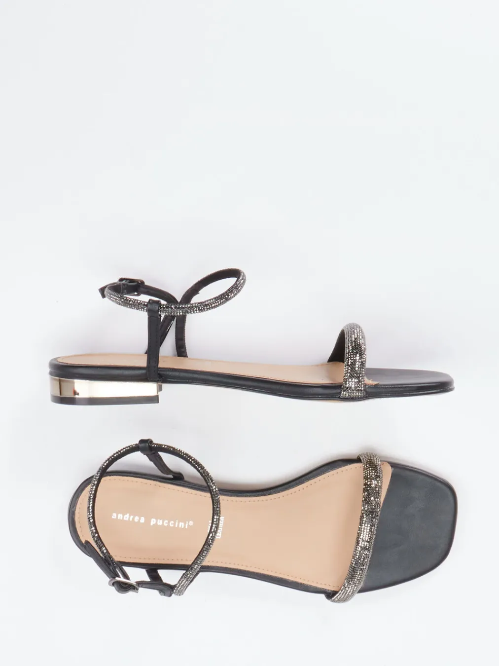 Glanzvolles Finish für stilvolle Abende.Die Marke Andrea Puccini präsentiert eine elegante Abendsandale für Damen. Die Kombination aus schwarzem Metallicleder und silberfarbenem Strassbesatz verleiht diesem Modell eine hochwertige, glamouröse Ausstrahlung. Die offene, flache Silhouette mit verstellbarem Knöchelriemen und transparentem Absatz mit metallischer Einlage sorgt für Balance aus Komfort und edlem Design. Besonders geeignet für festliche Anlässe oder den stilvollen Auftritt am Abend. Harmoniert hervorragend mit Metallic-Accessoires. Eleganz in zeitgemäßer Form – typisch Andrea Puccini.