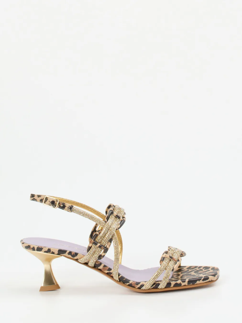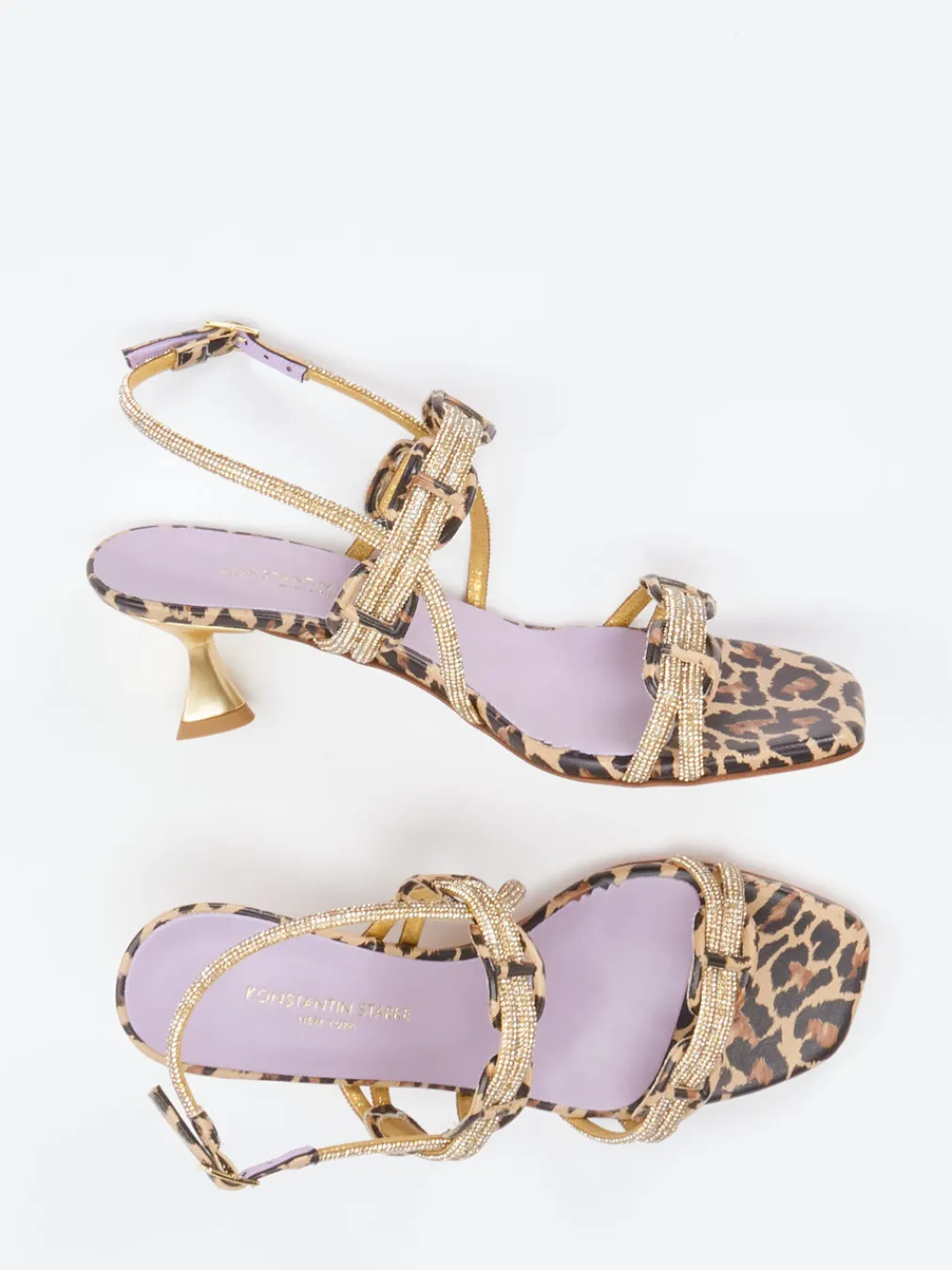 Ideal für Events mit Dresscode oder Clubnächte: Das fein geprägte Leder in braunem Leoprint trifft auf glitzernde Strassdetails und ein glänzendes Finish. Die offene, filigrane Silhouette mit Fesselriemen und goldfarbener Schnalle sorgt für sicheren Halt und visuelle Raffinesse. Ein 5 cm hoher Kitten Heel rundet den Look edel ab und unterstreicht modische Y2K-Vibes. Die Laufsohle aus Leder, kombiniert mit gepolstertem Fußbett, verspricht angenehmen Tragekomfort auch bei langen Abenden. Mit metallicfarbener Clutch ein perfektes Ensemble.
