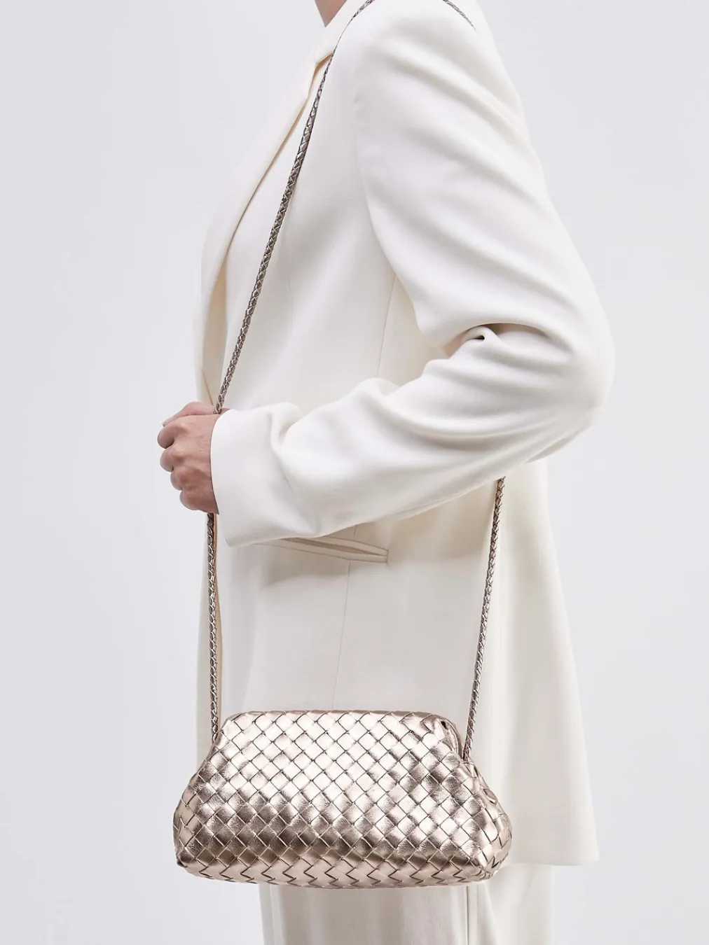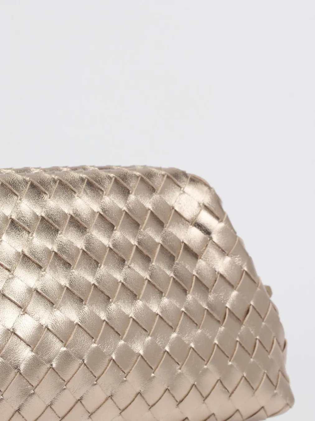 Die fein gearbeitete Trapezform und das champagnergoldene Metallic-Finish vereinen traditionelle Flechtkunst mit modernem Minimalismus. Ein elegantes Accessoire für stilvolle Auftritte.