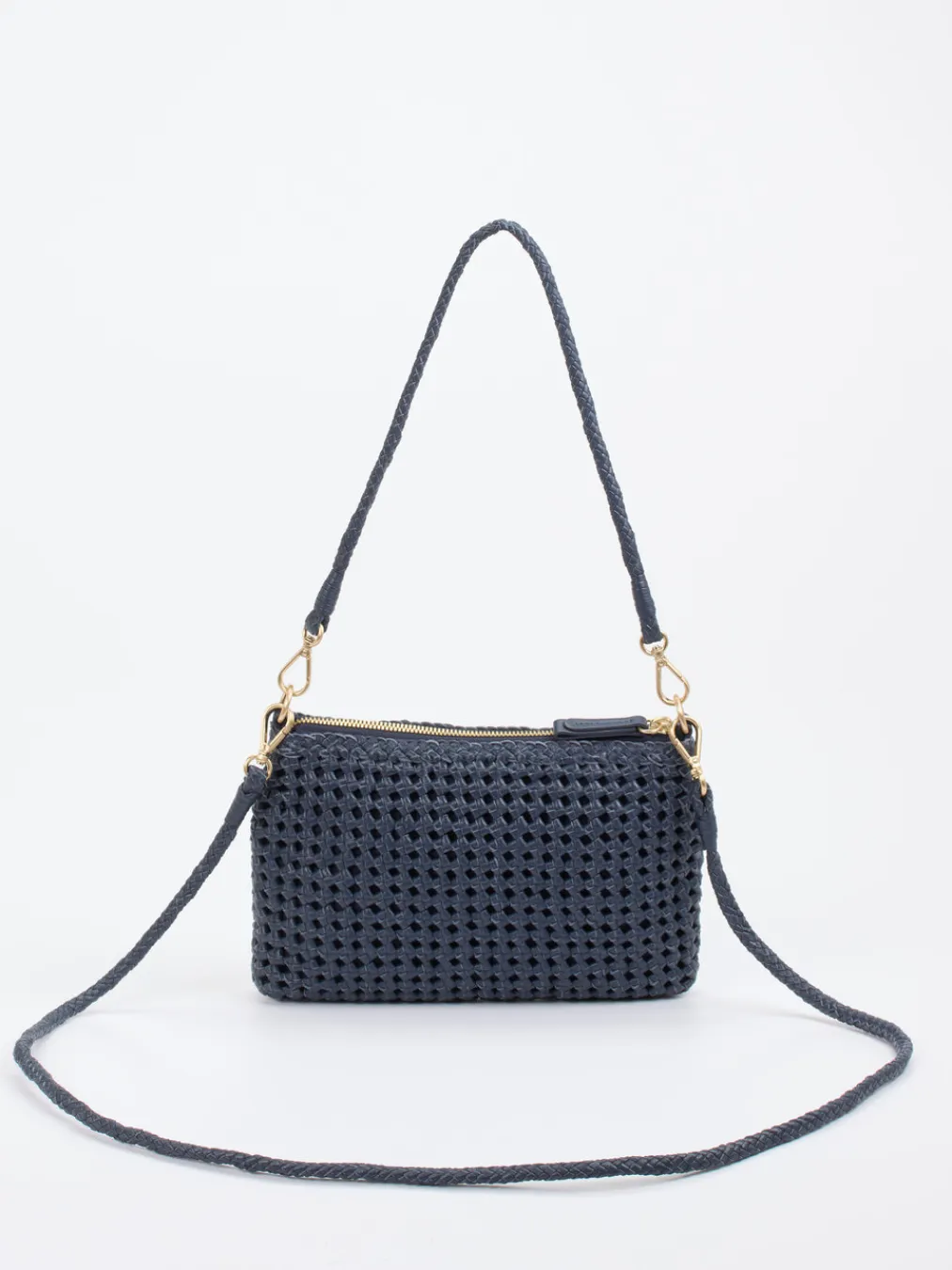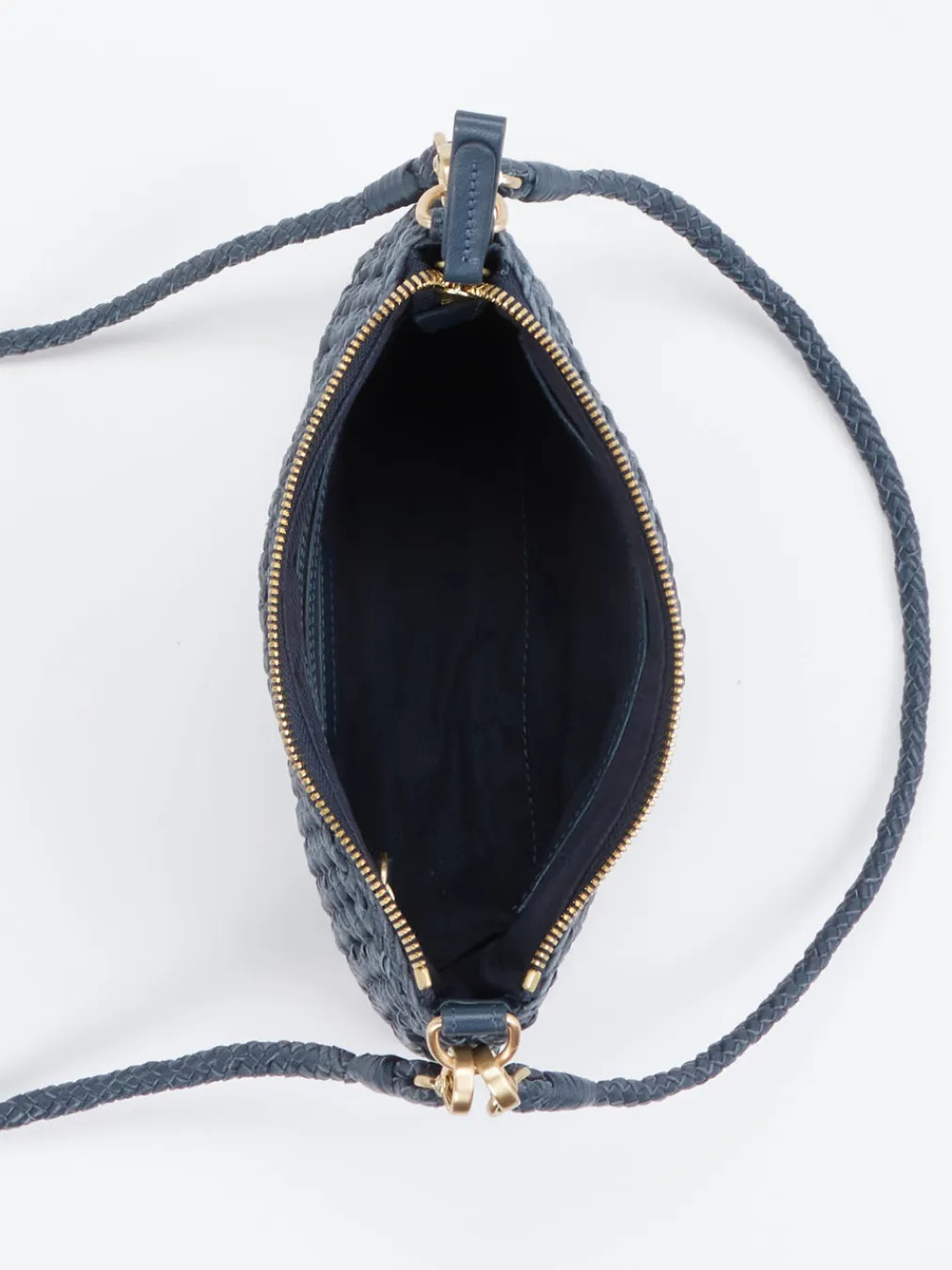 Geflochtenes Flechtleder in Dunkelblau sowie goldfarbene Details verleihen dieser Schultertasche von Allan K einen eleganten Touch mit sommerlicher Leichtigkeit.