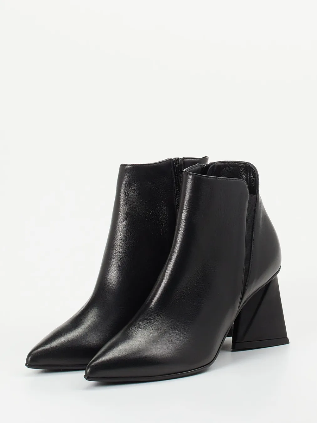 Das schwarze Kalbleder zeigt sich mit glänzender Oberfläche und betont die spitz zulaufende Form. Ein verdeckt integrierter Reißverschluss und ein dezenter Elasteinsatz garantieren eine schlanke Passform bei zugleich hohem Tragekomfort. Der 7,5 cm hohe Blockabsatz setzt ein modisches Statement und greift den Sculptural-Heels-Trend elegant auf. In Kombination mit Businesshosen oder Abend-Looks entfaltet dieses Modell seine zeitlose Ausstrahlung.