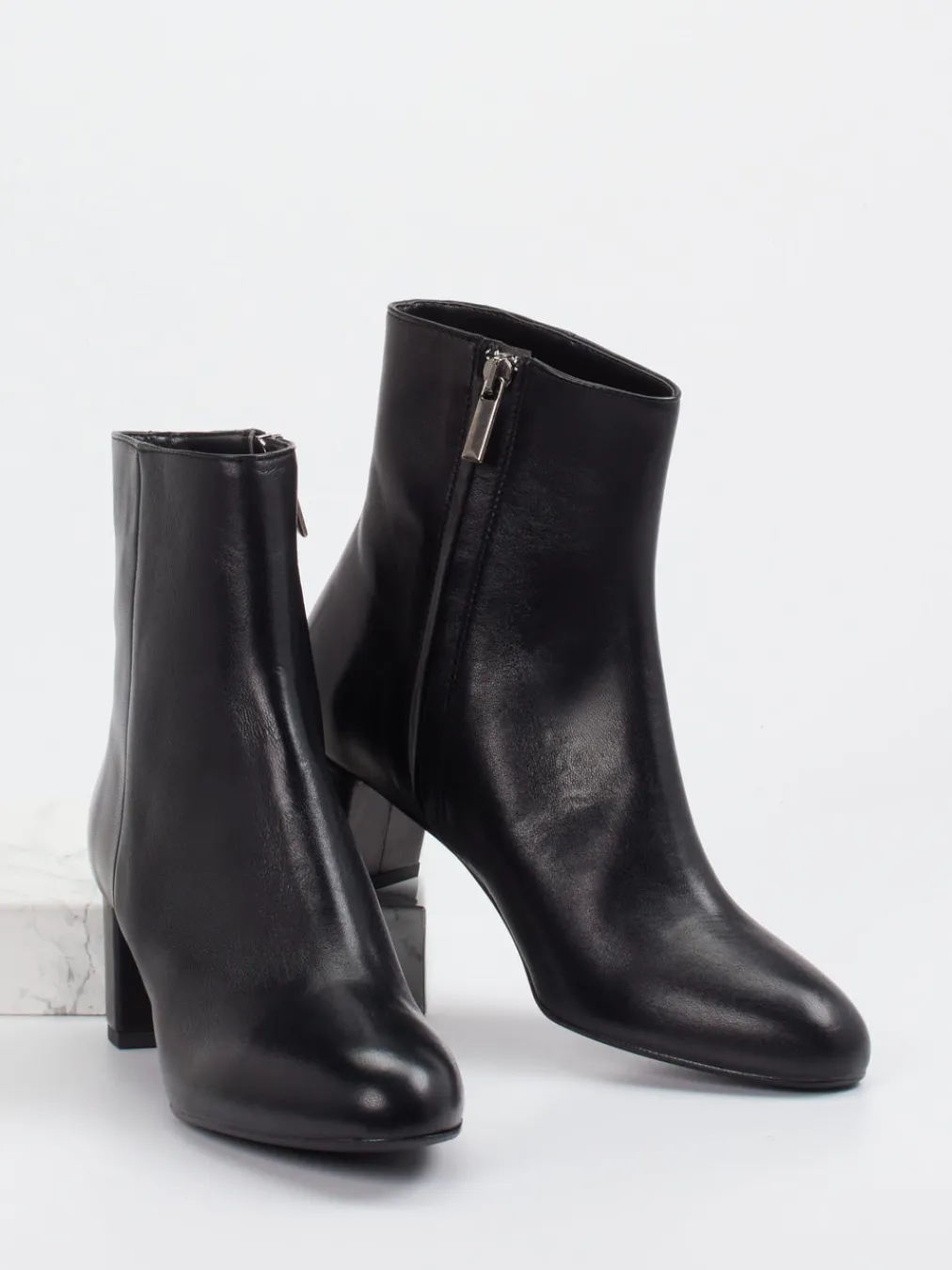 Für stilsichere Auftritte im Büro oder beim Stadtbummel bieten diese schwarzen Stiefeletten eine formstabile Silhouette aus hochwertigem Lammleder mit glänzender Oberfläche. Die klassische knöchelhohe Form wird durch einen silberfarbenen Innenreißverschluss betont – funktional und akzentuierend. Ein mittelhoher Blockabsatz mit strukturierter Gummisohle sorgt für Stabilität. Die Kombination aus minimalistischem Chic und „Quiet Luxury“-Charakter macht dieses Modell zur stilvollen Ergänzung urbaner Herbst/Winter-Garderoben.