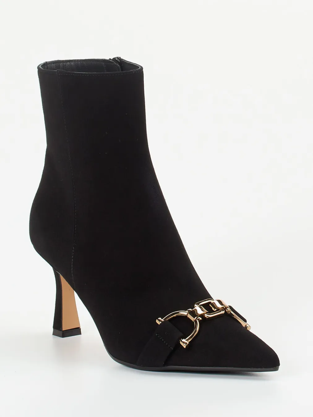 Diese Ankle Boots aus samtig schwarzem Veloursleder überzeugen mit eleganter Linienführung und goldfarbener Zierschnalle im Reiterstil – ein feminines Statement für formelle Anlässe.