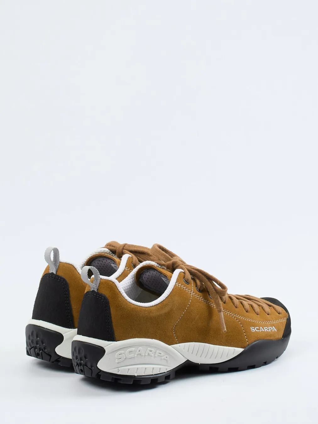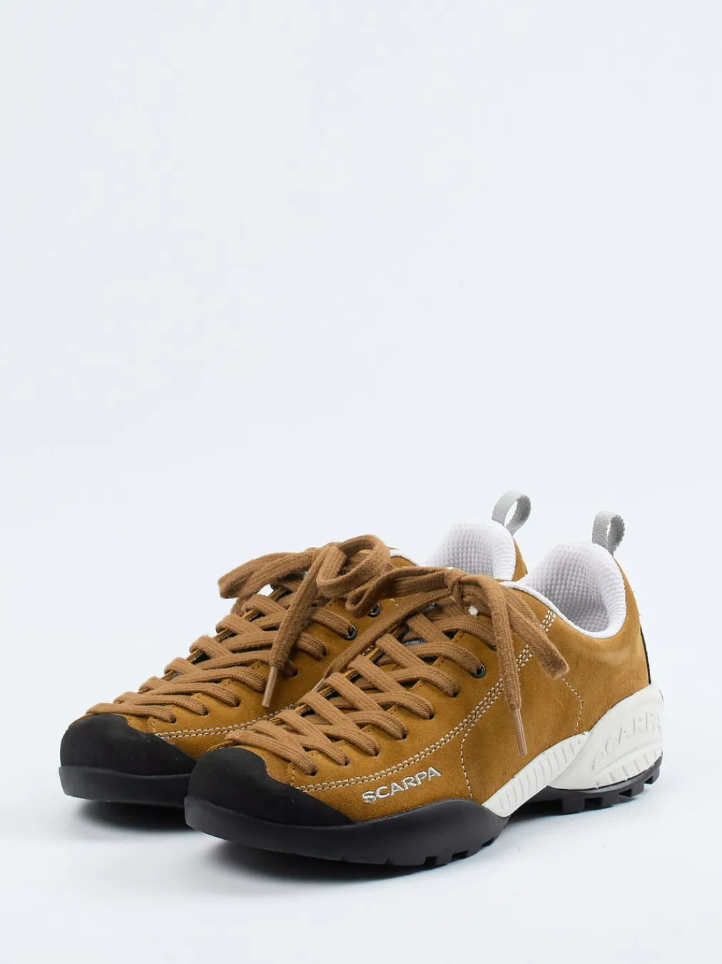 Funktion trifft auf urbanen Anspruch.Scarpa präsentiert einen funktionalen Approach-Schuh für Outdoor und Alltag. Der cognacbraune Schnürschuh aus samtig angeschliffenem Veloursleder überzeugt durch langlebige Qualität und sportlich-kompakte Form. Eine weiße-schwarze Vibram-Sohle mit kräftigem Profil bietet zuverlässigen Grip, während eine Komfort-Innensohle mit Dämpfung für angenehmes Tragen sorgt. Die tief angesetzte Schnürung, Zuglasche an der Ferse sowie eine gummierte Zehenkappe betonen den Outdoor-Charakter. Logo-Stickerei und Kontrastnähte setzen visuelle Akzente im Techwear-Stil – perfekt für Gorpcore-Ästhetik. Scarpa steht für performanceorientiertes Design mit präzisem Komfortanspruch.