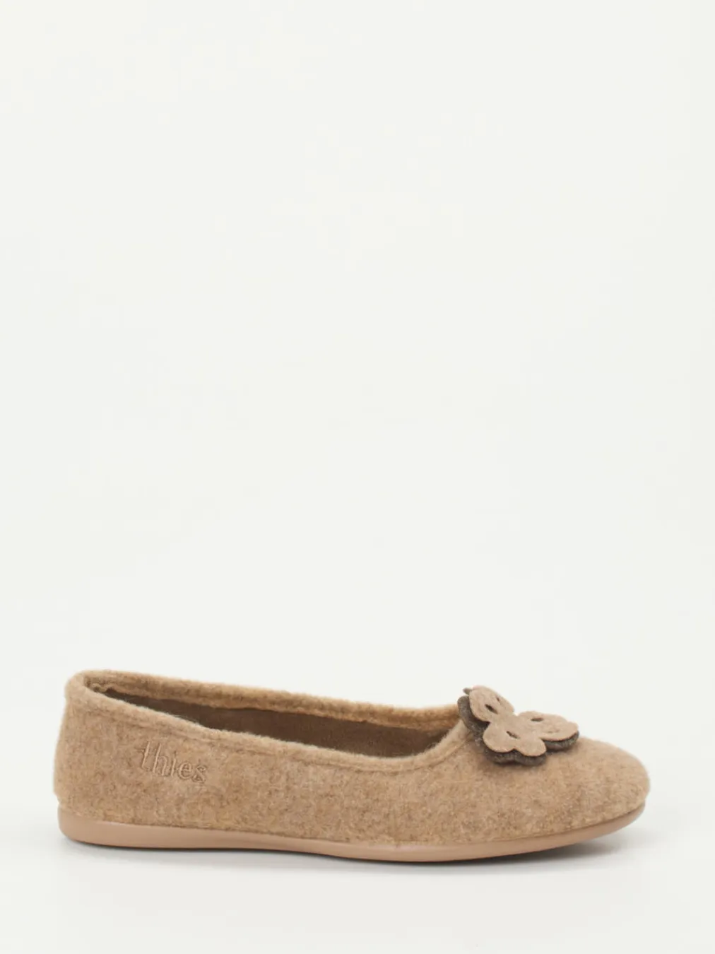 Stilvoller Komfort für Zuhause.Thies präsentiert einen femininen Ballerina-Hausschuh für gemütliche Momente in den eigenen vier Wänden. Der beigebraune Hausschuh aus natürlicher Wolle mit weich-flanelliger Oberfläche bietet durch das warme textile Innenfutter angenehme Wärme. Die klassisch runde Form in Schlupfausführung wird durch eine Ton-in-Ton Filzblüte auf dem Blatt charmant akzentuiert. Eine flexible Gummisohle mit Profil sorgt für rutschfesten Stand – perfekt für glatte Bodenflächen. Minimalistische Silhouette und skandinavisch inspirierte Farbgebung machen ihn zum modischen Begleiter im „Cozy Comfort“-Trend. Ein durchdachtes Wohlfühlprodukt mit nachhaltigem Anspruch und entspanntem Designfokus.
