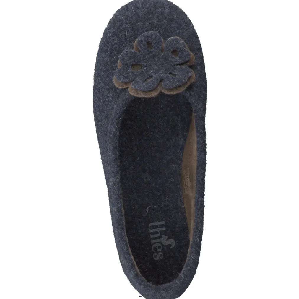 Thies präsentiert diesen Ballerina-Hausschuh für Damen aus dunkelblauem Wollfilz. Die klassisch-runde Silhouette und der Schlupfeinstieg sorgen für einen bequemen Sitz.