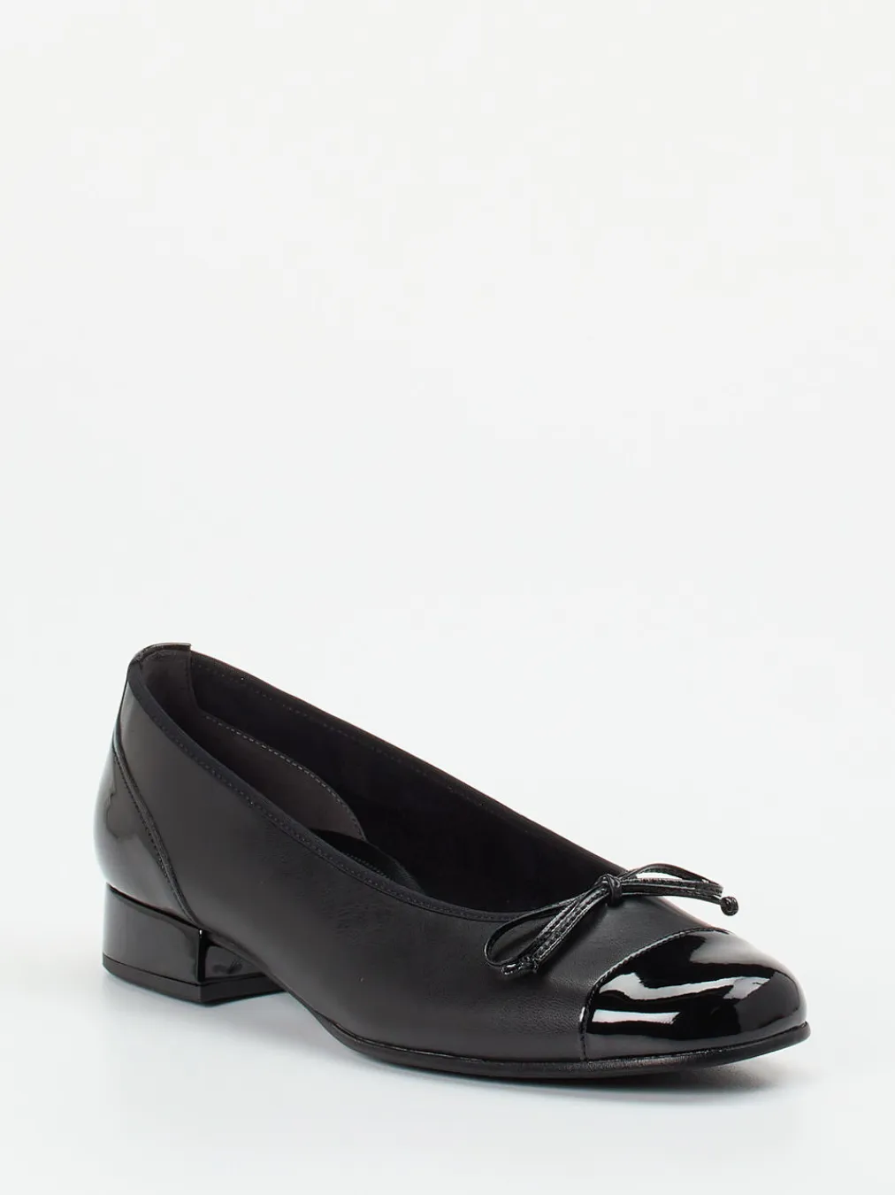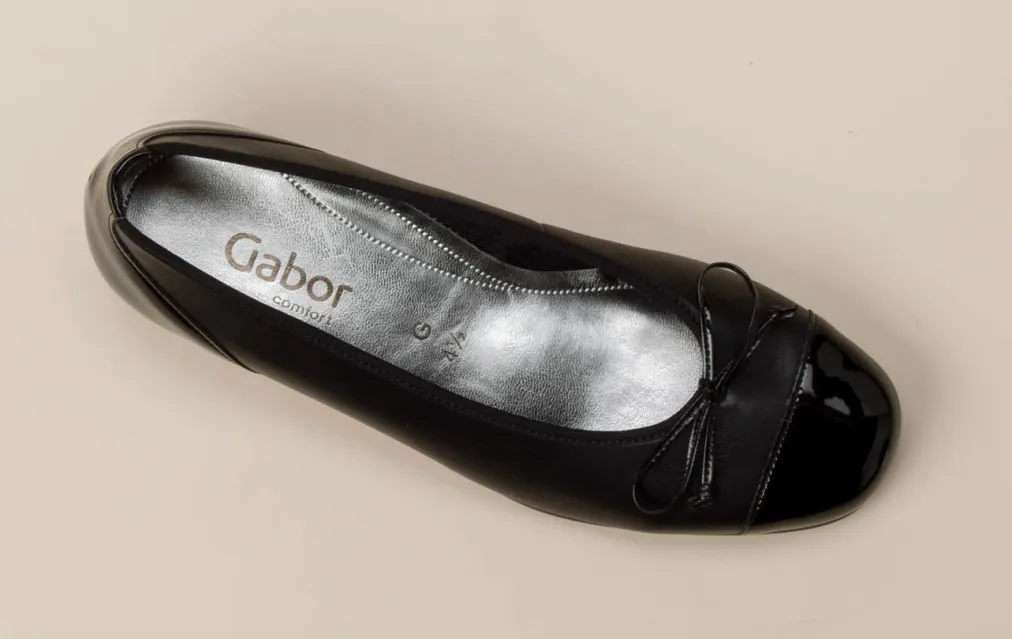 Eleganz im Alltag neu interpretiert.Gabor Comfort zeigt mit diesen Ballerinas ein Modell für Damen, das Komfort und Stil gekonnt vereint. Der Schuh richtet sich an alle, die im Büroalltag auf femininen Chic setzen und dabei nicht auf Bequemlichkeit verzichten wollen. Gefertigt aus hochwertigem Kalbleder mit samtig matter Oberfläche, brilliert das Design mit einer glänzenden Lackkappe und -ferse. Die klassische, abgerundete Silhouette mit dekorativer Schleife betont den zeitlosen Charakter. Der dezente Blockabsatz in 2,5 cm Höhe sorgt für Stabilität, während die weich gepolsterte Komfortsohle angenehm stützt. Die Kombination aus Schlupfform und G-Weite macht das Modell besonders tragfreundlich. Ein femininer Komfortschuh mit ruhiger Eleganz und dezenter Modernität.