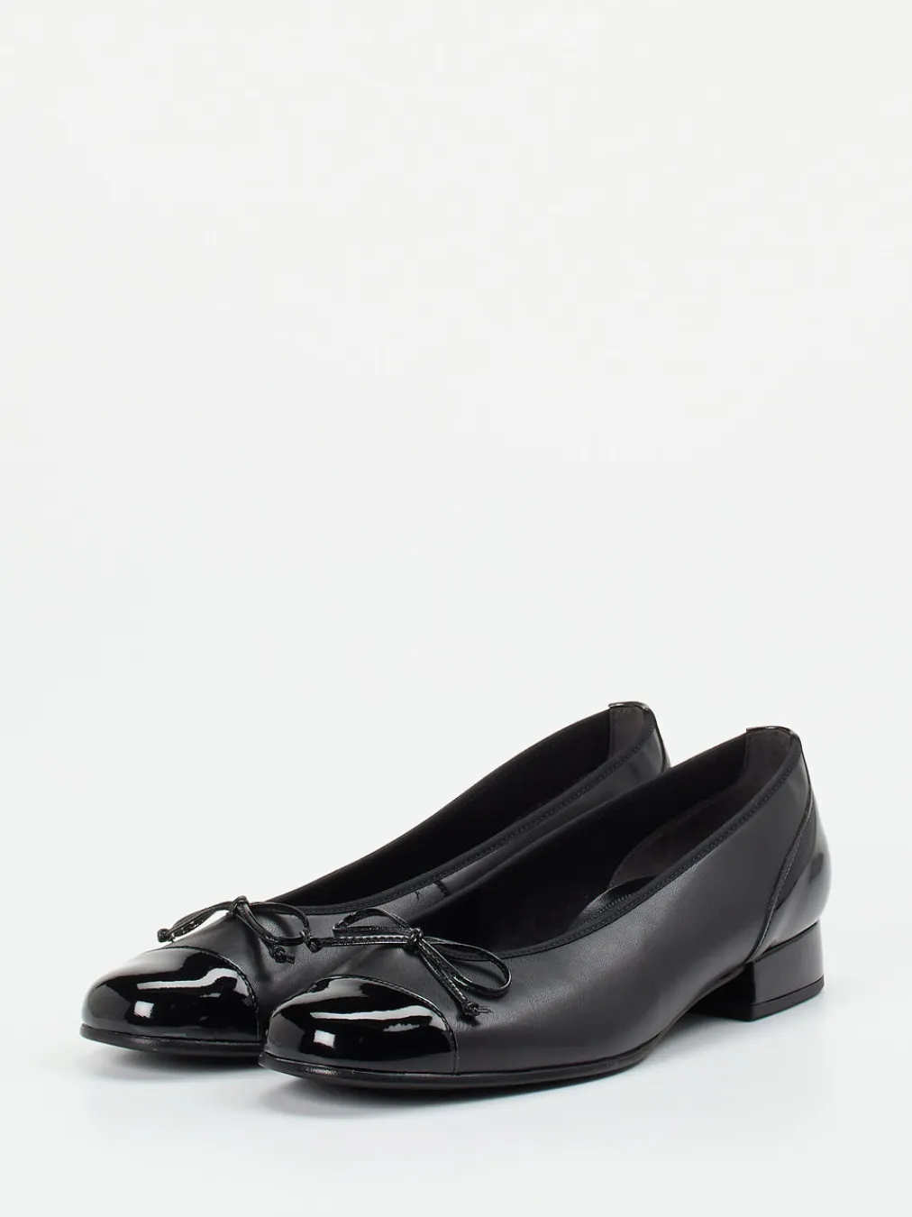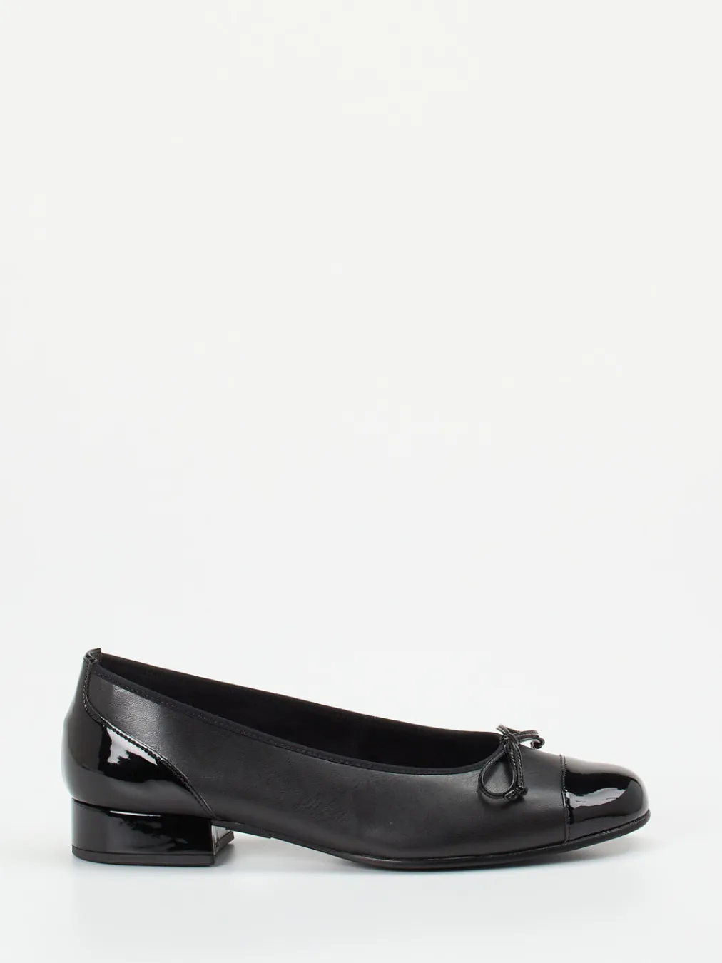 Die Kombination aus mattem Kalbleder und glänzenden Lackdetails verleiht diesen bequemen Ballerinas einen eleganten Twist – ideal für Büro und Alltag.