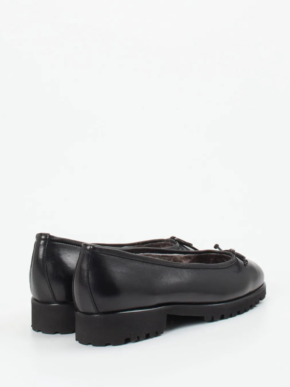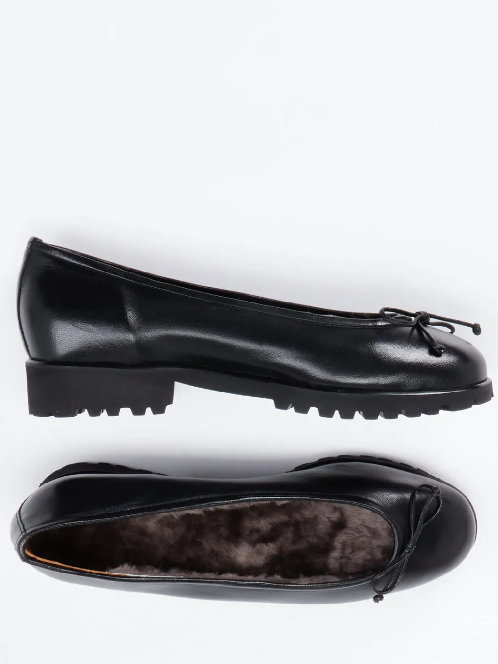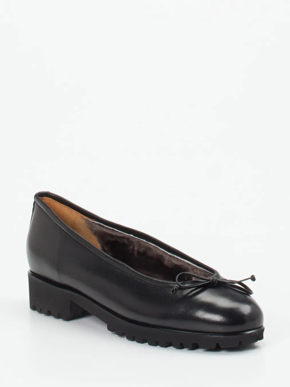 Winterkomfort mit klassischem Chic.Die Damen-Ballerinas von Mannori vereinen elegantes Design mit funktionaler Wärme. Ideal für kalte Alltagstage oder gemütliche Momente zu Hause: Das fein glänzende schwarze Lammleder harmoniert mit der traditionell runden Form und einer Ton-in-Ton Zierschleife. Innen sorgt kuscheliges Lammfell für angenehm warme Füße, während die profilierte Porosohle aus Gummi sicheren Tritt bietet – auch bei nasskaltem Wetter. Das Modell greift Minimalismus und Hybrid-Flats-Trends auf und spricht stilbewusste Komfortliebhaberinnen an. Ein hochwertiger Alltagsbegleiter mit klarer Formensprache und urbaner Funktionalität.