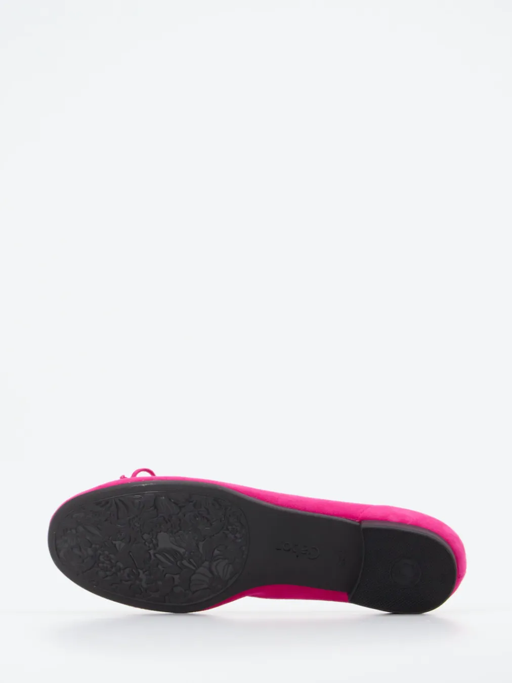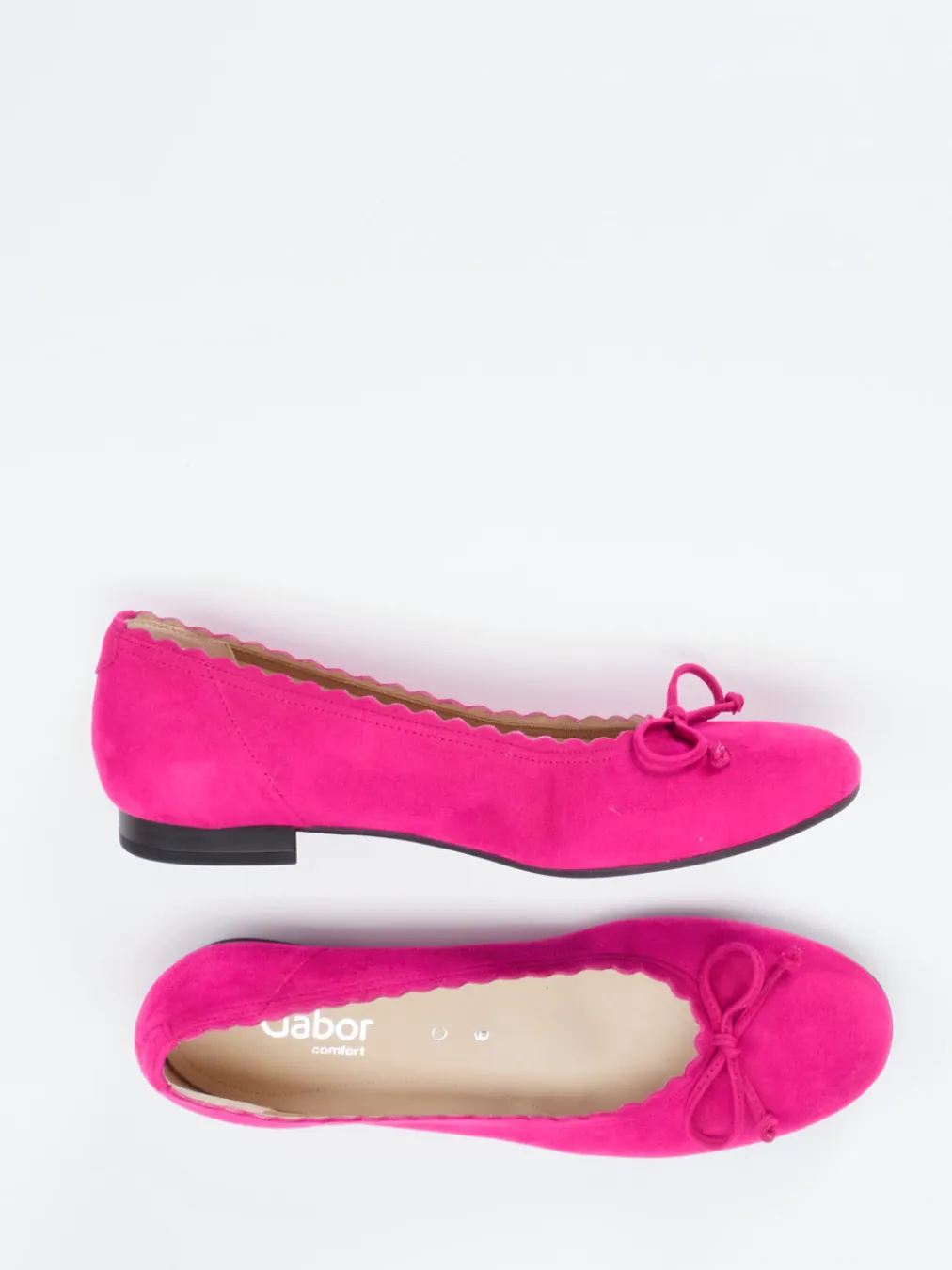 Gabor Comfort präsentiert klassische Ballerinas für Damen. Dieses Modell kombiniert weiches, pinkes Veloursleder mit einer gewellten Kantenverarbeitung sowie einer filigranen Schleife.