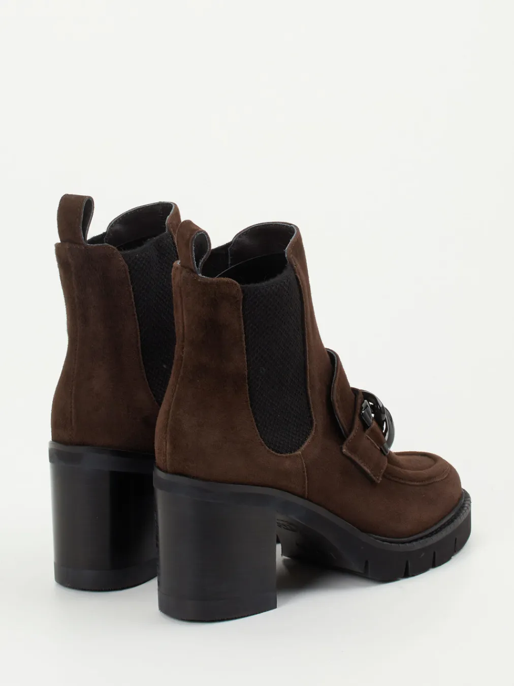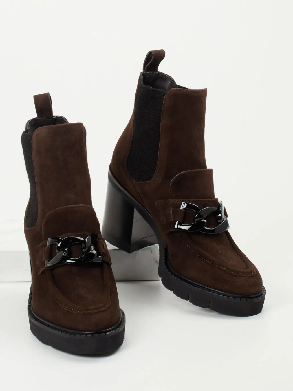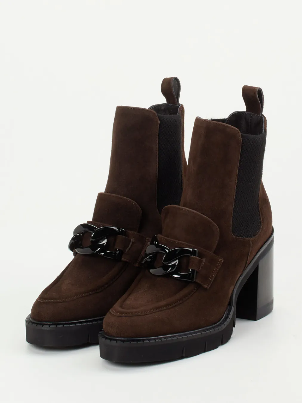 Die dunkelbraunen Damen-Stiefeletten von Mannori verbinden samtiges Veloursleder mit angesagtem Kettendetail. Loafer- und Chelsea-Elemente treffen auf modisch-harmonischen Minimalismus.