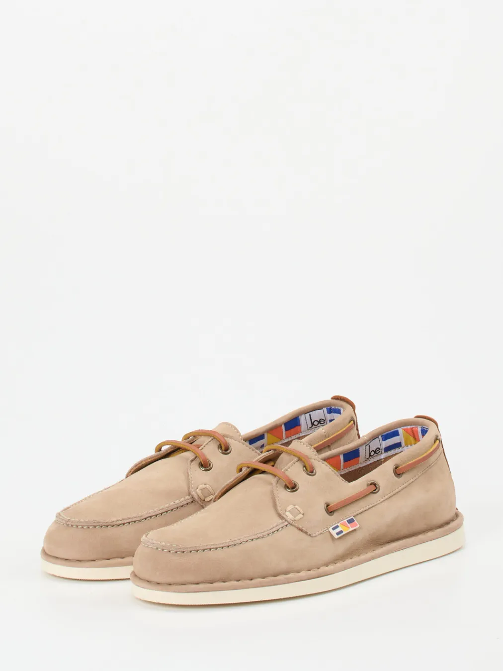 Der Bootsschuh von Joe kombiniert maritimes Design mit feinem Nubukleder in elegantem Beige. Für Freizeit und Urlaub ideal, setzt dieses Modell auf klassische Silhouette, weich angeschliffenes Nubuk und helle Steppnähte. Die umlaufende Lederschnürung und seitliche Metallösen sorgen für authentischen Bootsschuh-Charakter, während das bunte Logo an der Außenseite modische Akzente setzt. Eine flexible Gummisohle und ein weich gepolstertes Wechselfußbett bieten hohen Tragekomfort. Farblich harmoniert das Design mit „Soft Neutrals“ und passt zu Chino oder Poloshirt.