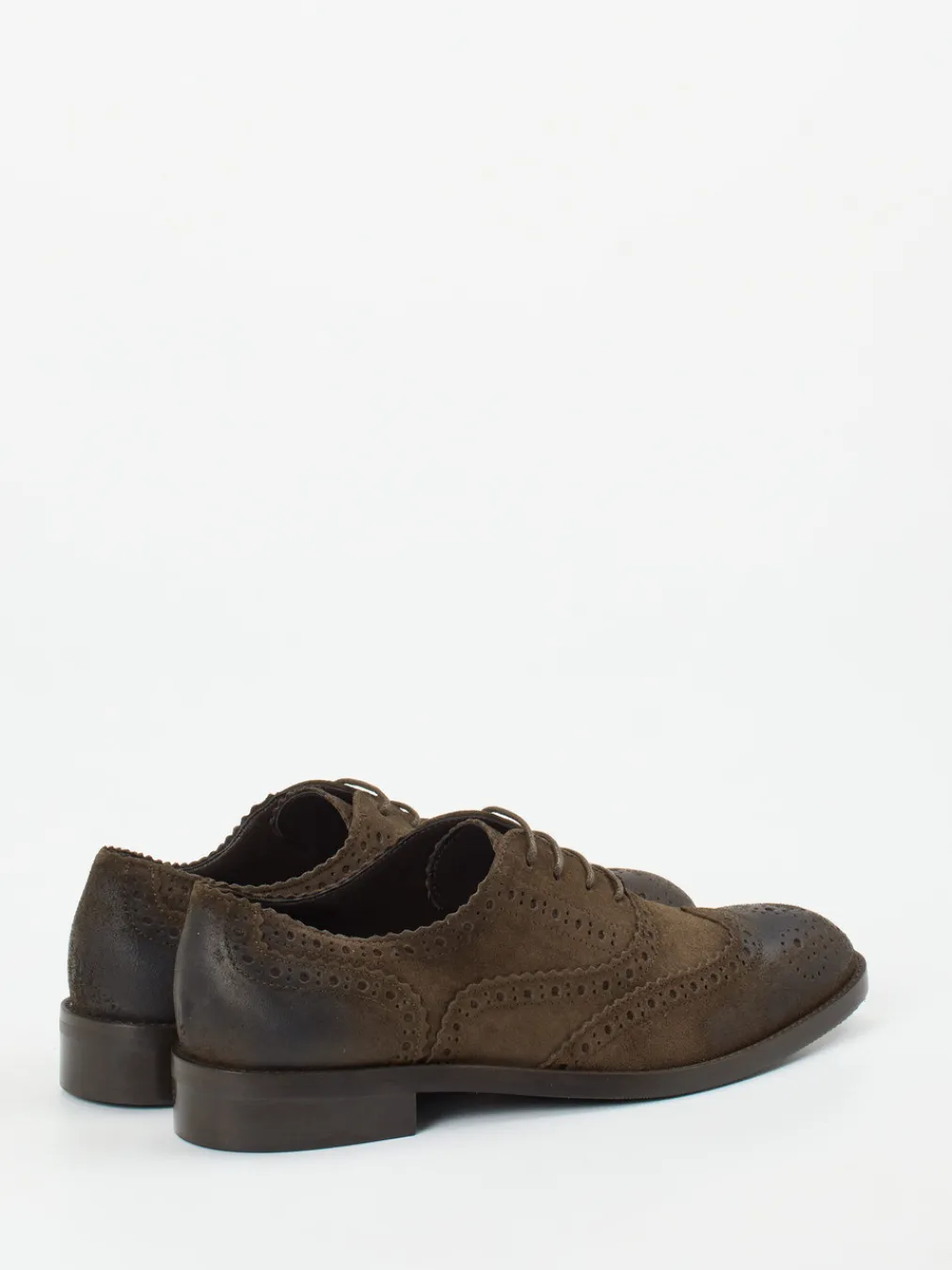 Ein Brogue-Klassiker in femininer Ausführung: Hochwertiges Veloursleder, edle Lyralochung und harmonischer Farbverlauf verleihen diesem Schnürschuh stilvolle Raffinesse.