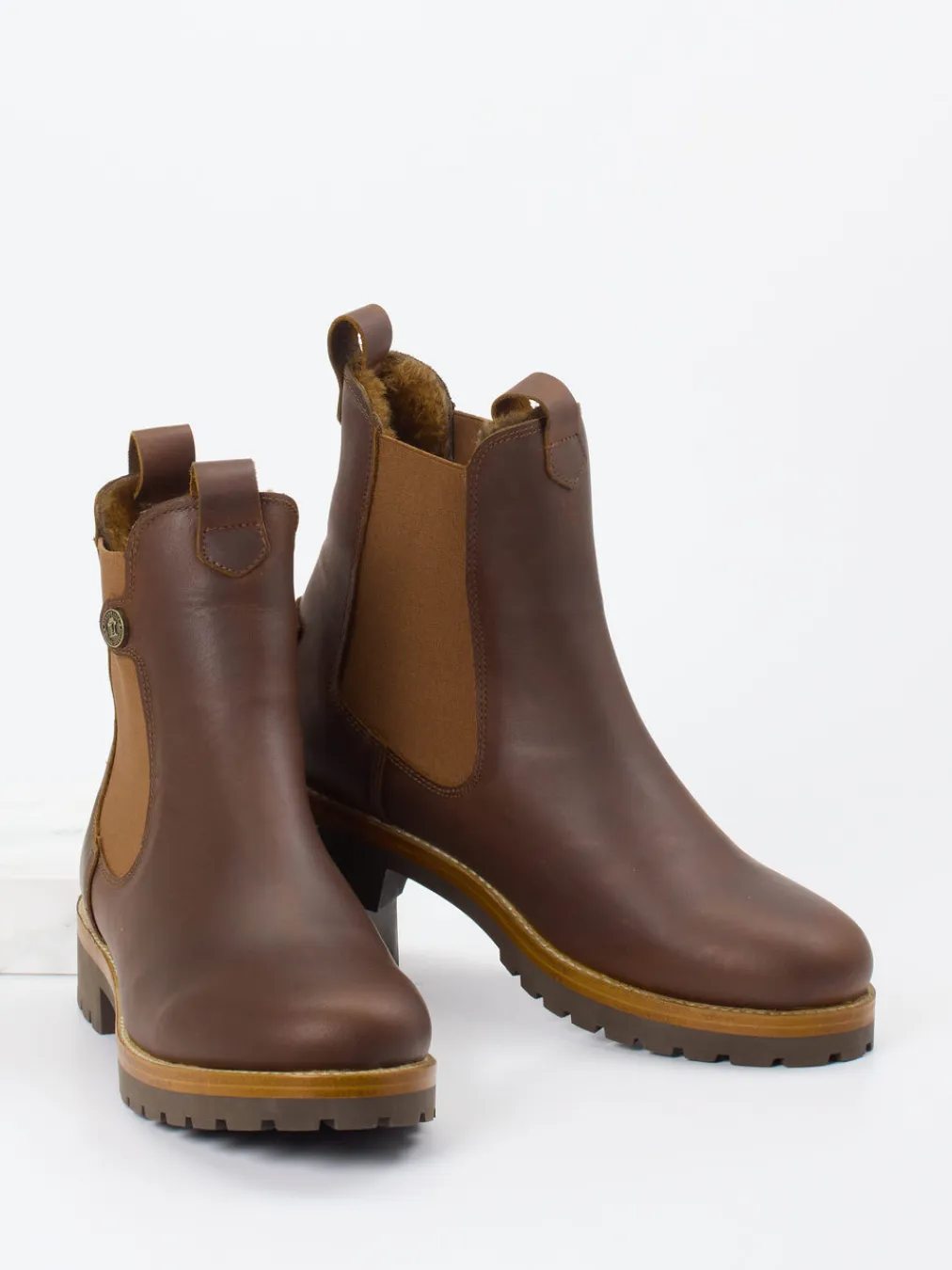 Formvollendet für kalte Tage.Die Chelsea Boots von Panama Jack vereinen klassische Linienführung mit winterfester Ausstattung. Ideal für lange Winterspaziergänge oder den alltäglichen Weg durch kühle City-Gassen: Gefertigt aus robustem, wasserabweisendem Fettleder mit samtmattem Finish zeigen sich diese Boots in Mittelbraun mit karamellfarbenen Akzenten. Seitliche elastische Einsätze in Rotbraun sorgen für komfortablen Einstieg, ergänzt durch charakteristische Zuglaschen und ein dezent logogeprägtes Metall-Detail. Innen schützt weiches Lammfellfutter vor Kälte, während die profilierte Gummisohle mit holzfarbenem Rahmen sicheren Halt bietet. Der Chelsea-Stil bleibt dabei durchgängig klassisch. Panama Jack steht für langlebige Qualität und funktionelles Design mit Stilbewusstsein.