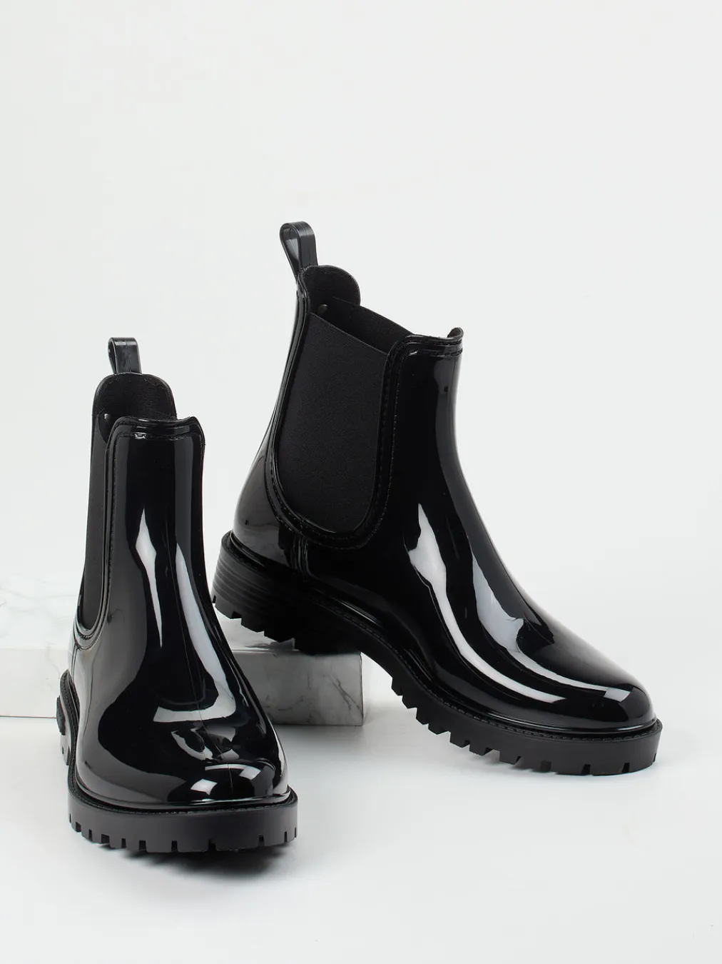 Das glänzende Finish und die robuste Profilsohle machen diese Chelsea Boots zur stilvollen Wahl für nasse Tage mit modischem Anspruch.