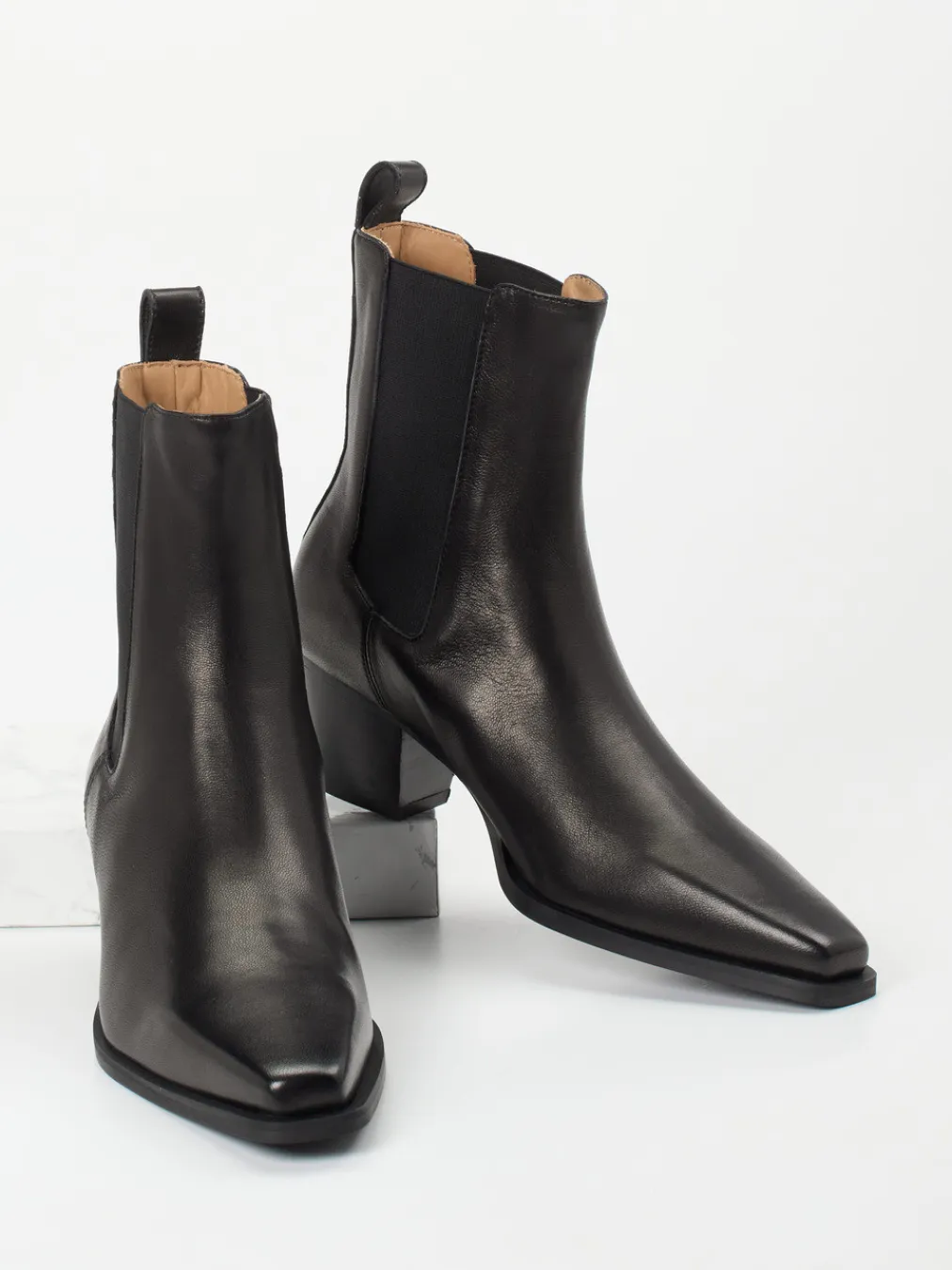 Diese Copenhagen-Stiefelette überzeugt mit spitz zulaufender Form, feinem Glattleder und tonalen Elastikeinsätzen – ein stilvolles Bekenntnis zu Minimalismus mit Western-Akzent.