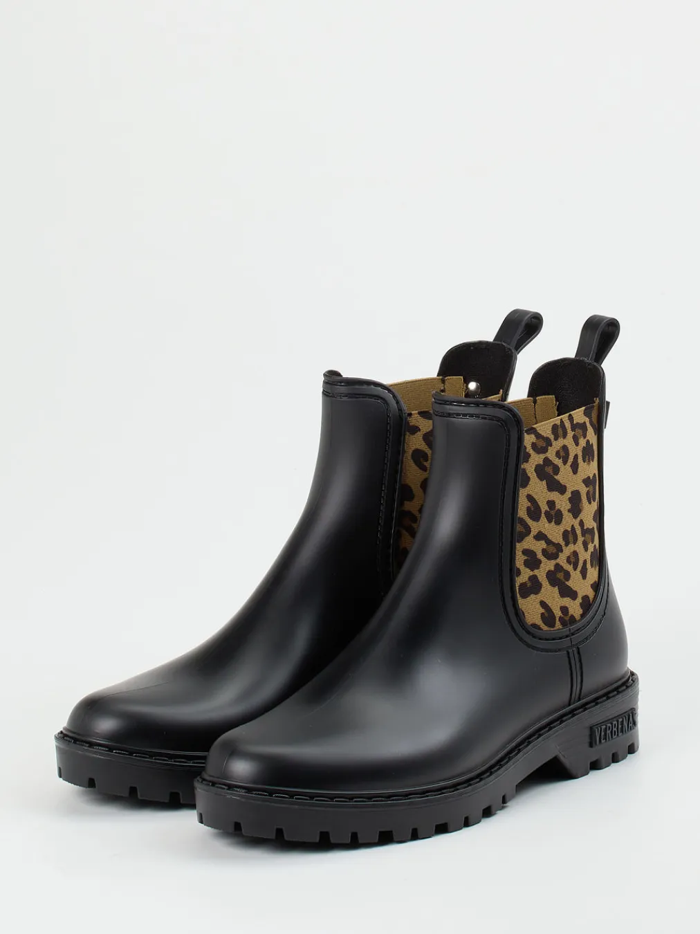 Verbenas präsentiert wetterfeste Chelsea Boots für Damen, gefertigt aus schwarzem Gummi mit elastischem Leo-Einsatz.