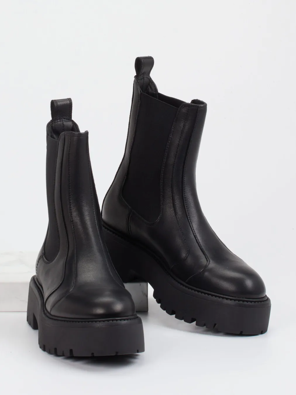 Schwarz. Stark. Stilbildend.Copenhagen präsentiert diese elegante Damen-Stiefelette der Kategorie Chelsea Boots. Wenn im Alltag stilsichere Vielseitigkeit gefragt ist, überzeugt dieses Modell mit hochwertigem Kalbleder in matter Optik. Das klassische Schwarz unterstreicht die geradlinige, knöchelhohe Form. Charakteristisch: seitliche Elastikeinsätze und praktische Zuglaschen in Schlupfform. Die markante Gummisohle mit profilierter 5-cm-Absatzhöhe greift den aktuellen „Heavy Sole“-Trend auf. Streetwear und Business Casual finden hier eine gemeinsame Grundlage. Optimal kombinierbar mit Oversized-Mänteln oder puristischen Herbst-Looks. Ein klarer Stilcode, der den minimalistischen Anspruch der Marke konsequent umsetzt.