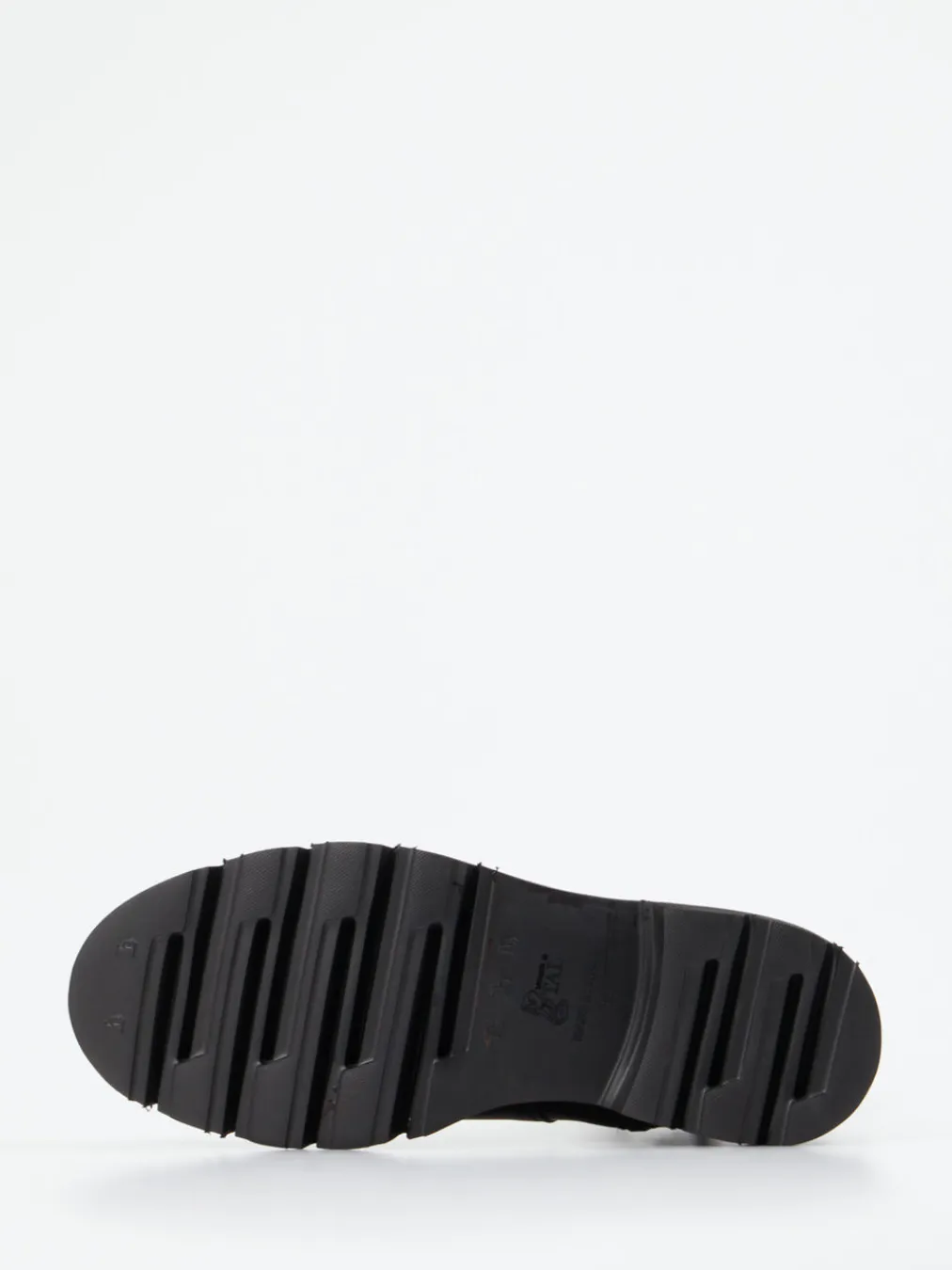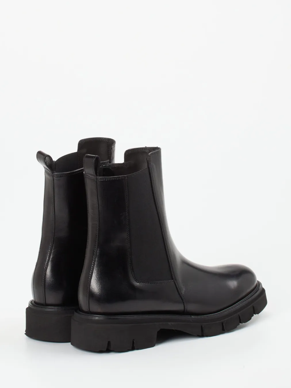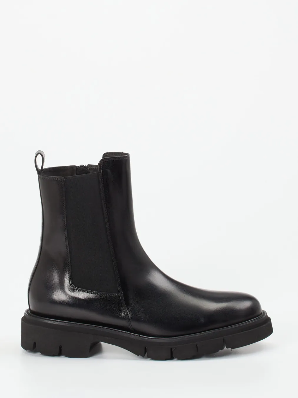 Ideal für den modernen Alltag zwischen Stadtbummel und Büro: Das schwarze Kalbleder zeigt sich in glänzender Ausführung und wirkt besonders edel. Ton-in-Ton gearbeitete Elastikeinsätze und seitliche Zuglaschen erleichtern das Anziehen. Die klobige Gummisohle im Heavy-Sole-Trend schenkt ein urbanes Finish und unterstützt ein angenehmes Laufgefühl – verstärkt durch das weiche Lederfutter. Die schmale Silhouette passt hervorragend zu Kaschmirmantel oder Hosen in Zigarettenform.