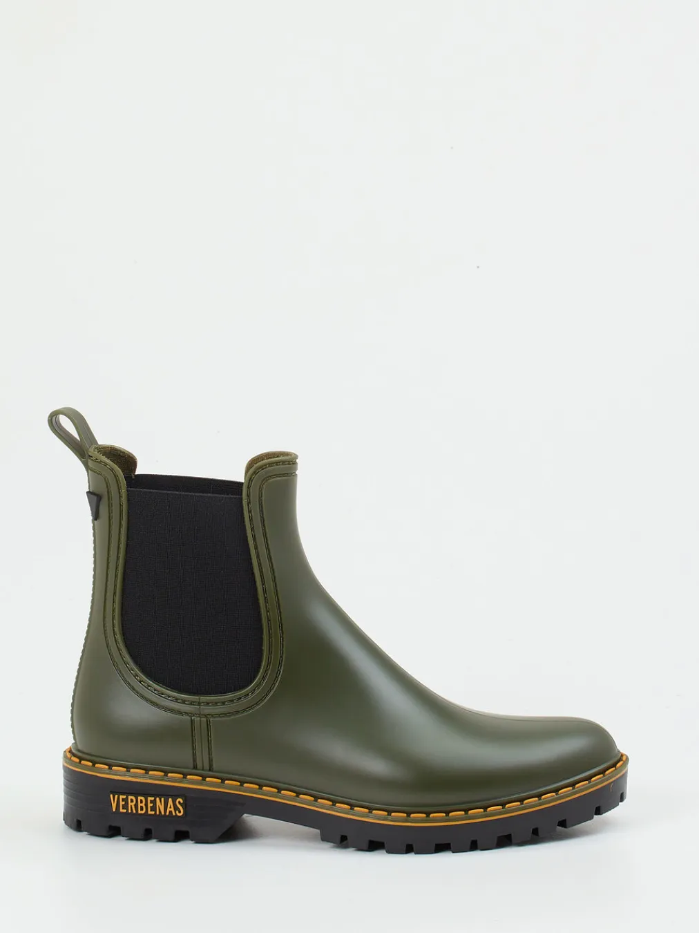Robust im Alltag, stilvoll im Detail.Die Marke Verbenas zeigt mit diesen Chelsea Boots aus der Kategorie Gummistiefel ein funktionales Statement für nasse Tage. Ob auf herbstlich nassen Straßen oder beim Spaziergang durchs nasse Gelände: Das olivgrüne Synthetikmaterial mit matter Oberfläche schützt zuverlässig vor Feuchtigkeit. Seitliche Elastikeinsätze in Schwarz und eine auffällige Kontrastnaht in Orange verleihen den knöchelhohen Stiefeletten eine moderne Note. Die griffige Kreppsohle mit gelbem Logo-Detail garantiert Stabilität auf nassem Untergrund. Inspiriert von Gorpcore und Minimalismus, lassen sich die Boots vielseitig kombinieren – etwa zur lässigen Outdoor-Jacke. Regenfeste Leichtigkeit trifft bei Verbenas auf urban durchdachte Funktionalität.