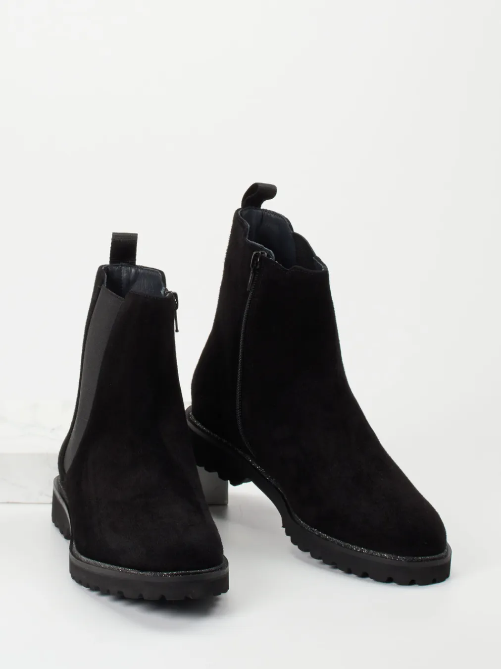 Diese Chelsea-Stiefelette aus samtigem Veloursleder verbindet urbanen Minimalismus mit durchdachter Alltagstauglichkeit – ideal für smartes Styling an kühlen Tagen.