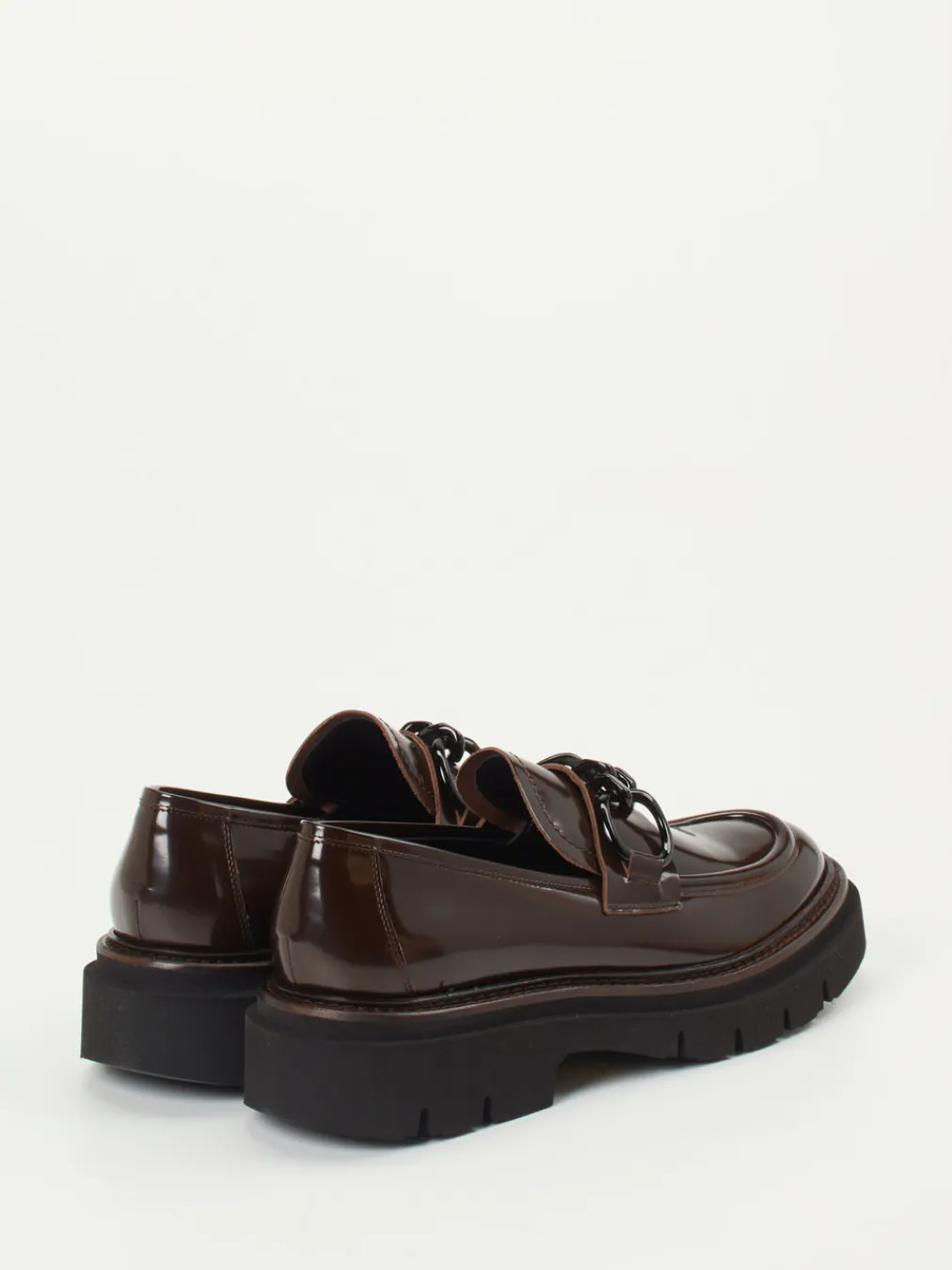 Die glänzende Oberfläche in Dunkelbraun und das markante Kettendetail verleihen diesem Chunky Loafer von Mannori einen urban-eleganten Charakter mit modischem Anspruch.