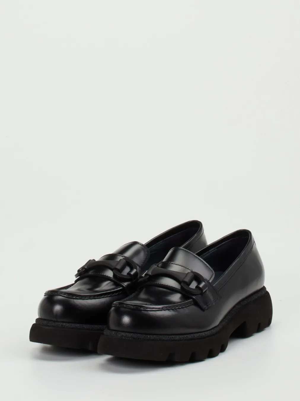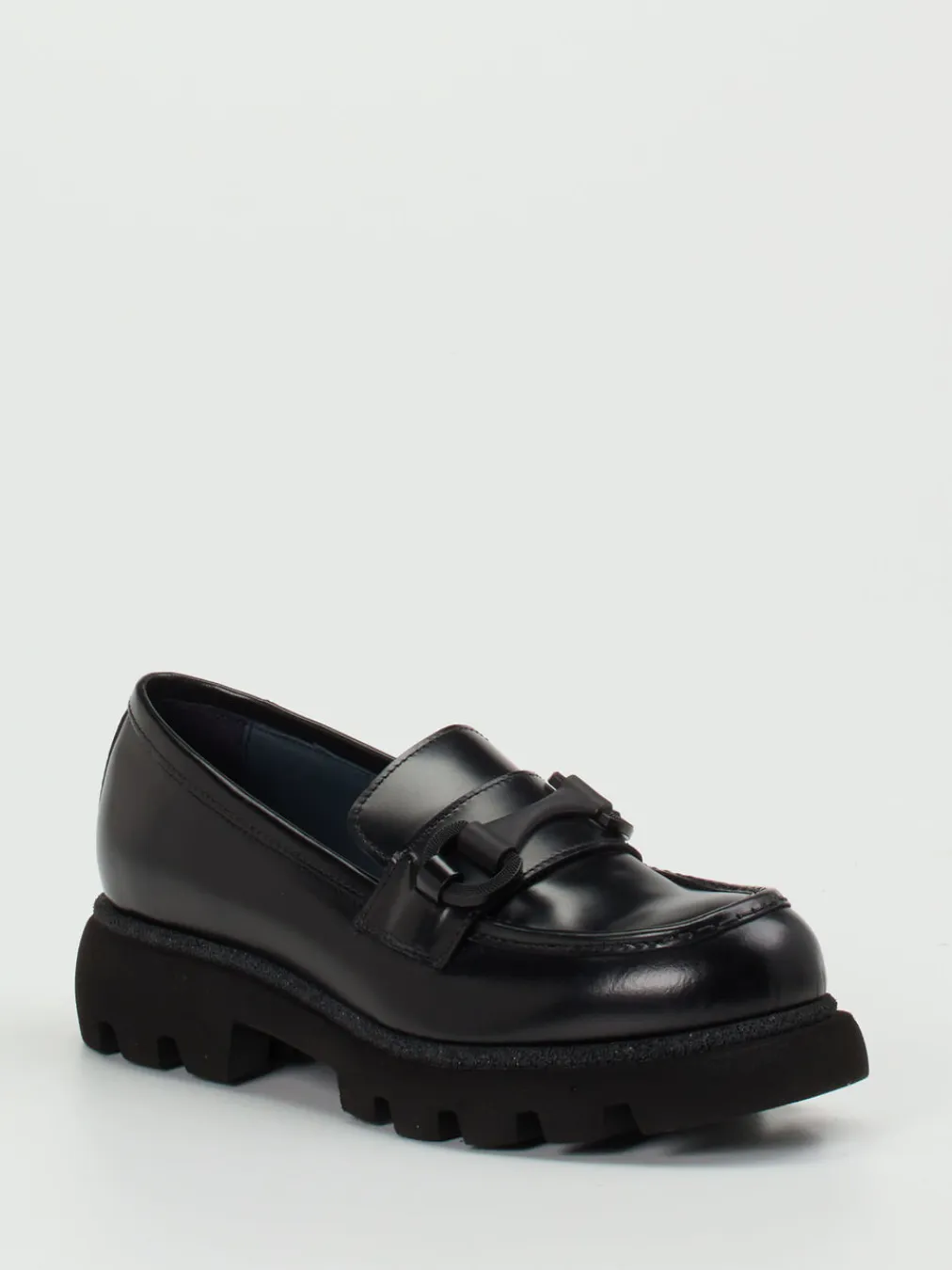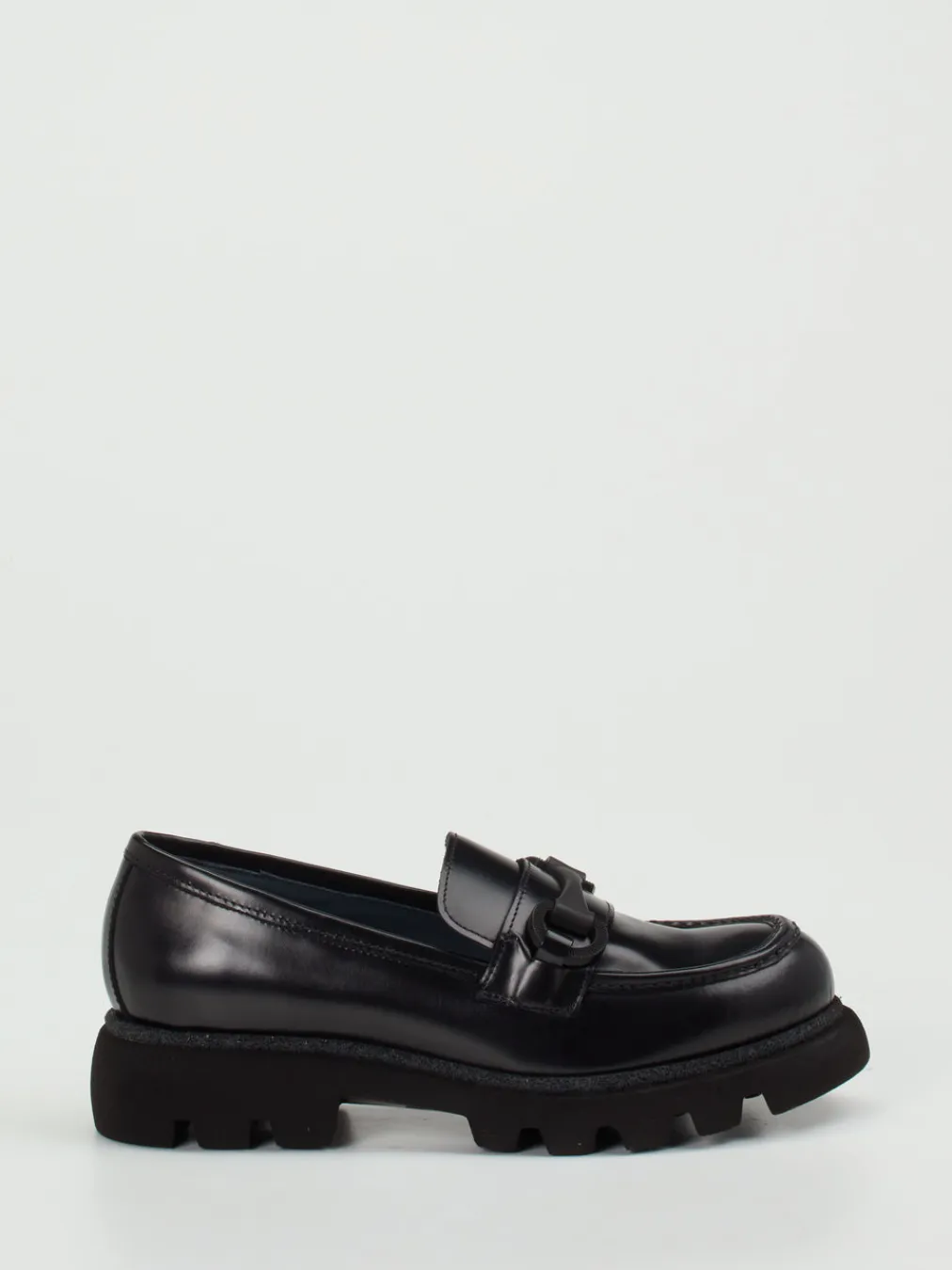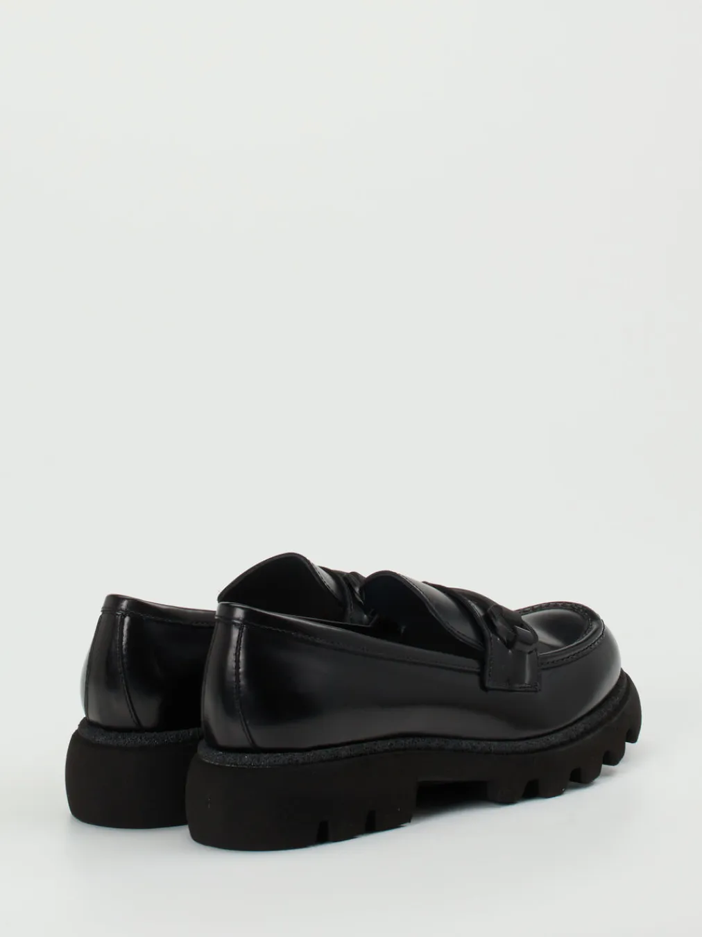 Dieser schwarze Chunky-Loafer aus Hochglanzleder kombiniert streetwaretaugliche Volumen mit puristischer Eleganz – ein Highlight für trendbewusste Looks mit Understatement.