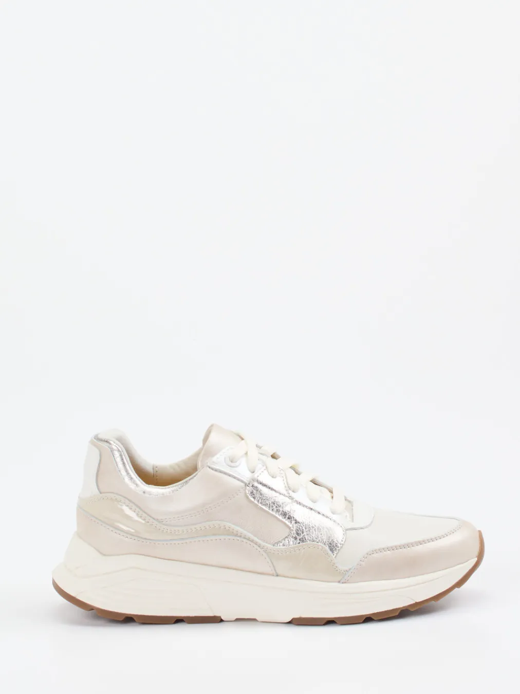 Bequemlichkeit trifft Streetstyle.XSENSIBLE interpretiert den Chunky Sneaker neu und verbindet Funktionalität mit modischem Appeal. Die Kombination aus beigefarbenem Metallicleder und samtigen Textilpartien schafft ein kontrastreiches Obermaterial mit glänzender und matter Oberfläche. Silberfarbene Applikationen setzen stilvolle Akzente, während die mehrlagige Gummisohle in Karamellton für optimale Dämpfung sorgt. Die breite Silhouette, gepolsterte Schaftränder und das atmungsaktive Lederfutter unterstreichen den Komfortanspruch. Inspiriert vom Streetwear-Trend ist dieses Modell die perfekte Wahl für trendorientierte Looks im Alltag. Lässt sich besonders gut zu cremefarbenen Jogpants und silberner Crossbody-Bag kombinieren. Stilsicherer Freizeitbegleiter mit dynamischer Formensprache und durchdachter Ergonomie.