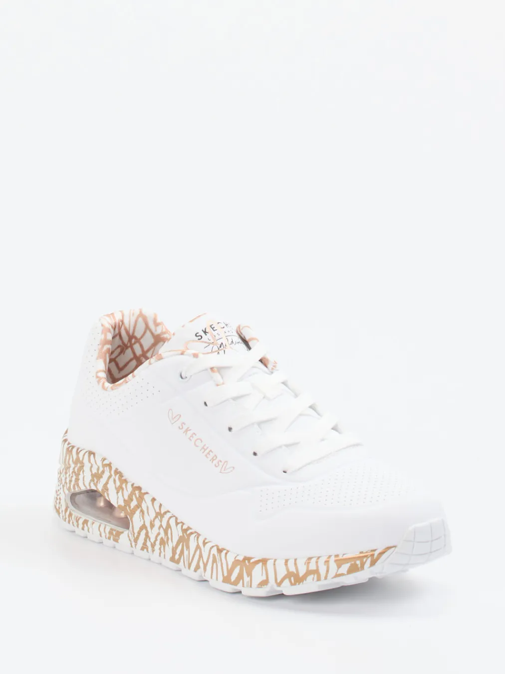 Statement-Sneaker mit Komfortfaktor.Skechers präsentiert einen Chunky-Sneaker für Damen, der modischen Anspruch mit Tragekomfort vereint. Ideal für trendorientierte Freizeit-Outfits punktet das Modell mit weißem Nubukleder, das samtig angeschliffen wirkt. Die markante Silhouette mit gepolstertem Einstieg, Grafikmuster-Zwischensohle in Beigebraun und sichtbarem Luftpolster-Element spricht den Y2K-Trend an. Eine klassische Schnürung, das strukturierte Gummiprofil sowie ein Markenlogo mit Herzsymbol runden das Design ab. Perfekt zu Leggings und Hoodie für einen expressiven Streetstyle-Look. Ein Sneaker mit Stil und Substanz – ganz in Skechers-DNA.