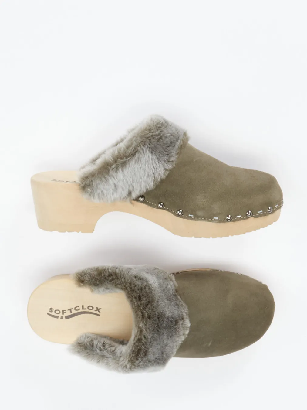Softclox interpretiert klassische Damen-Clogs neu: aus samtigem Veloursleder in Olivgrün mit flauschigem Lammfellfutter für höchsten Komfort.