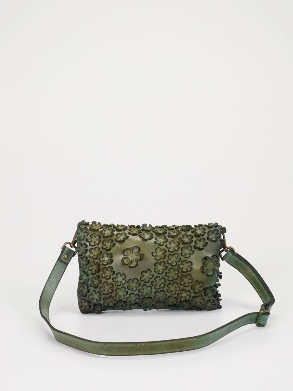 Die kunstvoll gearbeitete Clutch vereint hochwertiges Kalbleder mit detaillierten 3D-Blüten und antikgoldener Hardware – ein stilvoller Akzent für entspannte Boho-Looks.