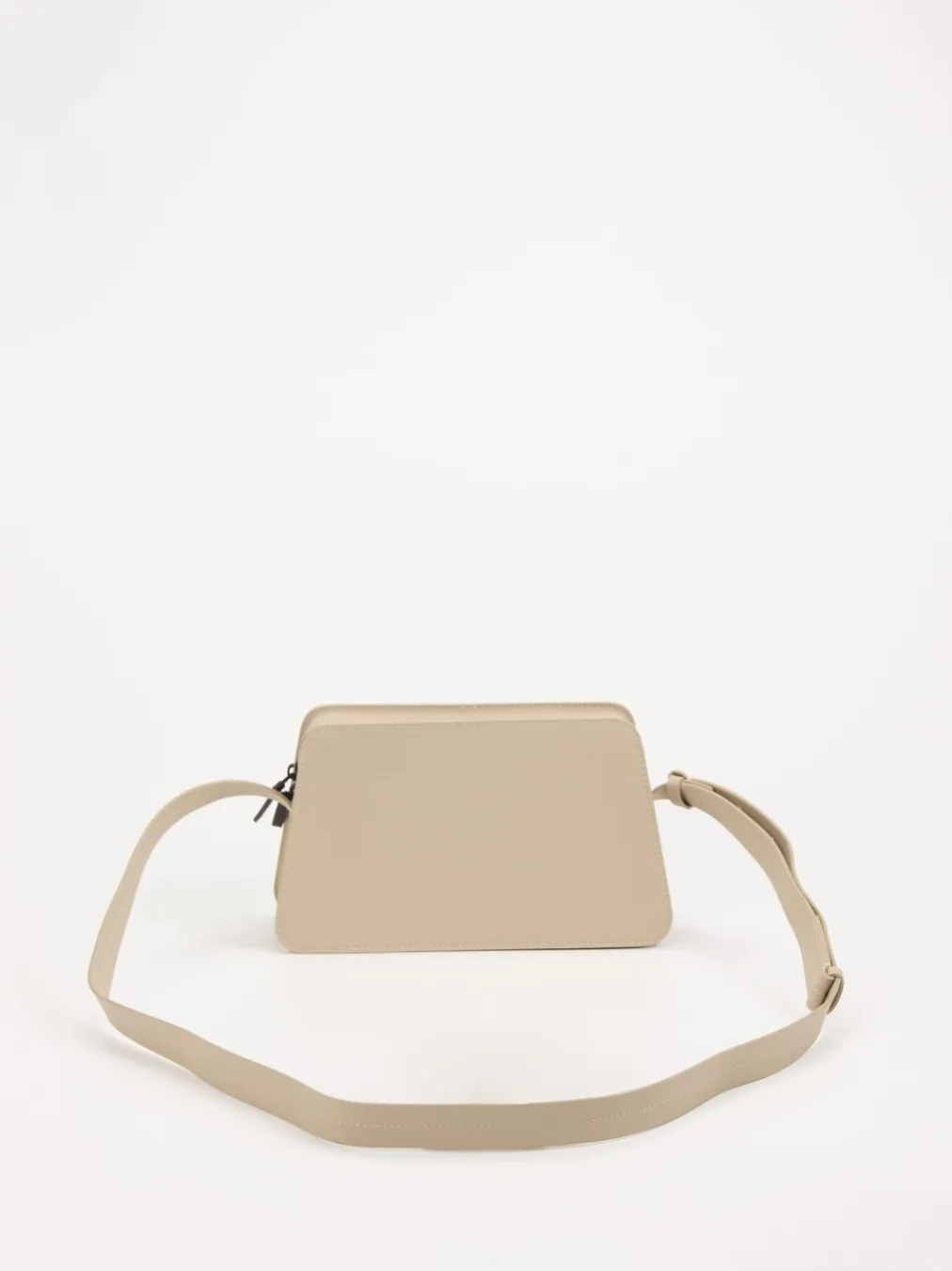 Diese Schultertasche kombiniert recyceltes Material mit minimalistischem Design und einer modernen Trapezform – ideal für urbane Looks zwischen Büroalltag und Freizeit.