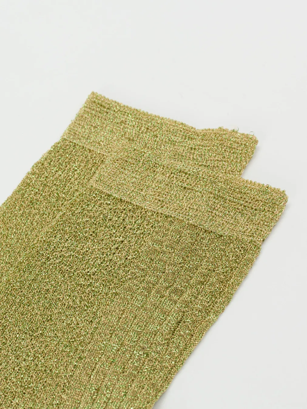 Ein glamouröses Accessoire für ausdrucksstarke Stil-Kombinationen: Die goldgrünen Glitzersocken von Alto Milano verbinden eleganten Lurex-Schimmer mit moderner Y2K-Ästhetik.