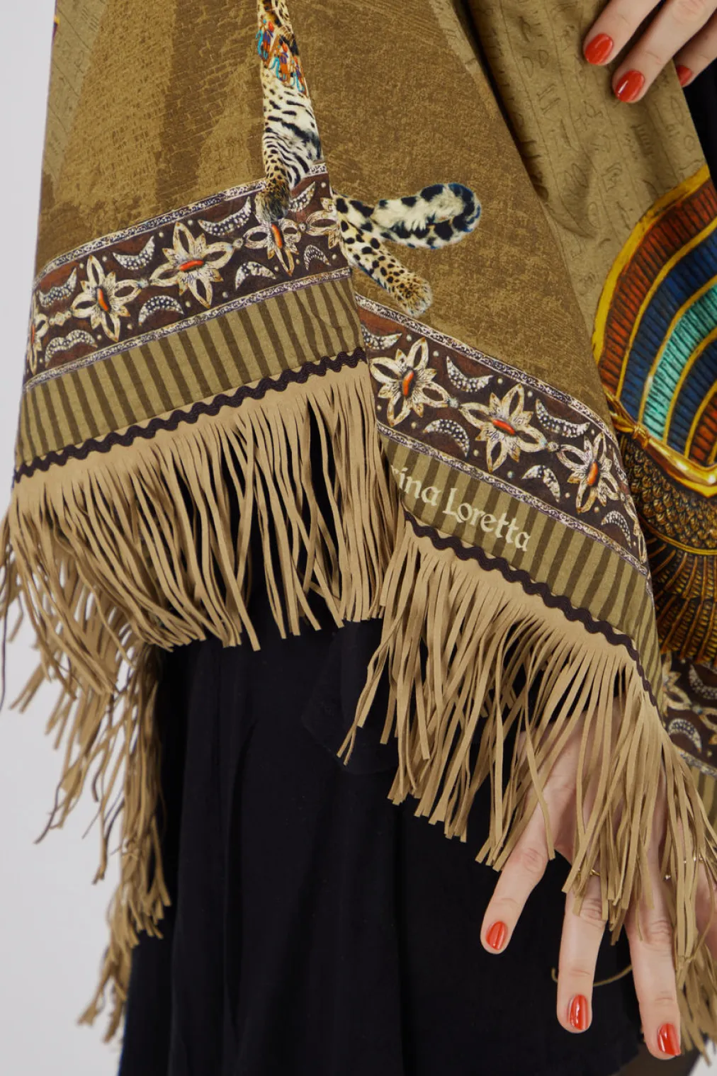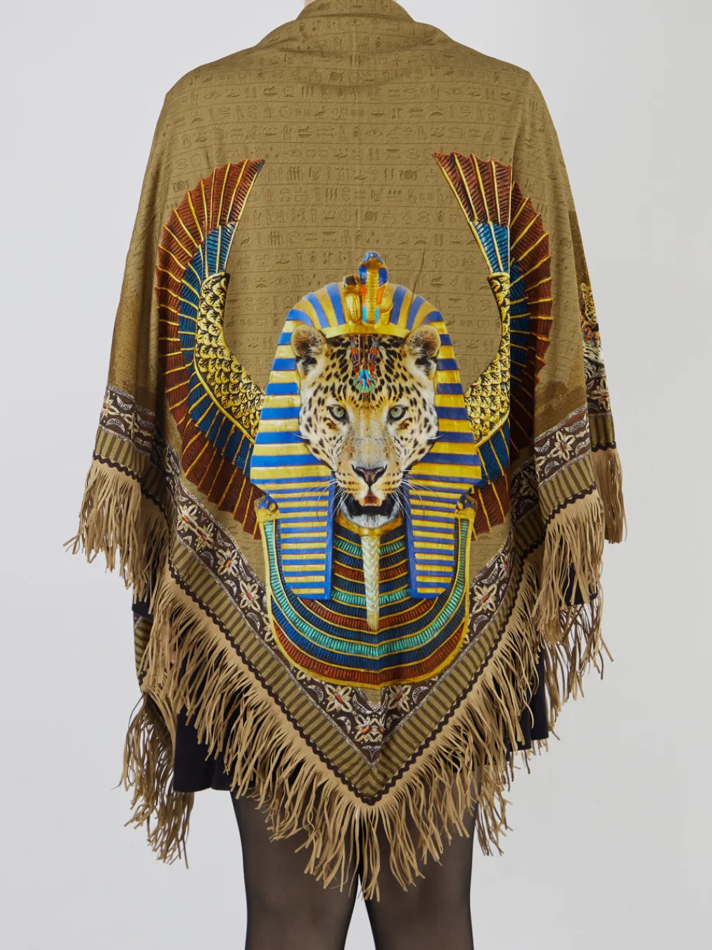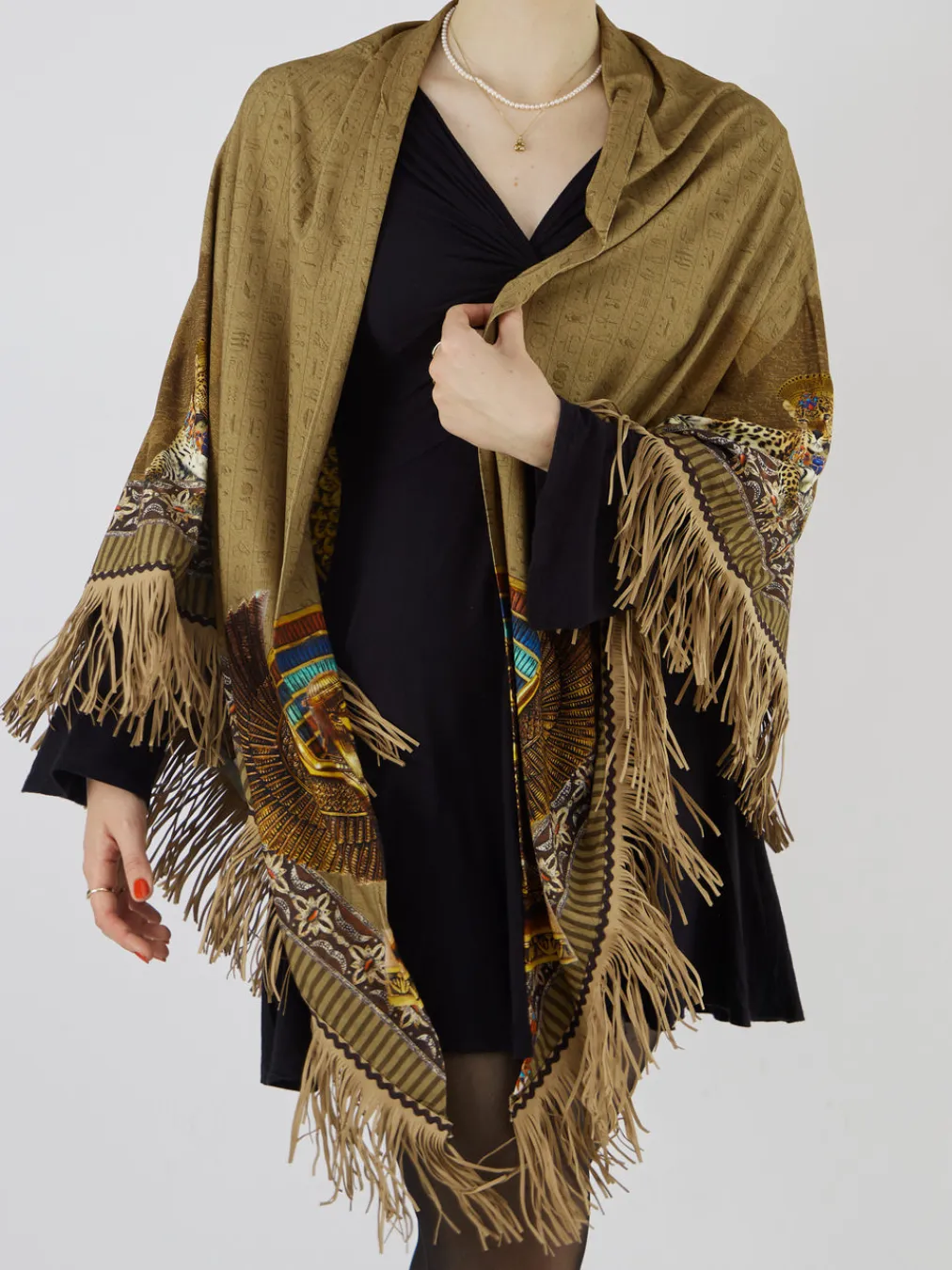 Statement-Stück mit ägyptischem Print. Katherina Loretta präsentiert mit diesem Fransenponcho ein außergewöhnliches Damen-Accessoire. Ideal für entspannte Urlaubstage oder kreative Freizeitlooks überzeugt das Modell mit seiner cognacbraunen Farbgebung, aufwendigen Bordüren und einem imposanten Leoparden-Pharao-Motiv im Rückenbereich. Gefertigt aus weichem Textil mit matter Oberfläche und ergänzt durch Kunstlederfransen, wirkt die dreieckig drapierte Form besonders ausdrucksstark. Der offene Schnitt ermöglicht vielseitige Stylingoptionen rund um schwarze Kleider oder goldfarbenen Schmuck. Trendstark kombiniert das Cape detailreiche Prints mit moderner Silhouette. Ein Design, das modisches Selbstverständnis und kreative Freiheit verkörpert.