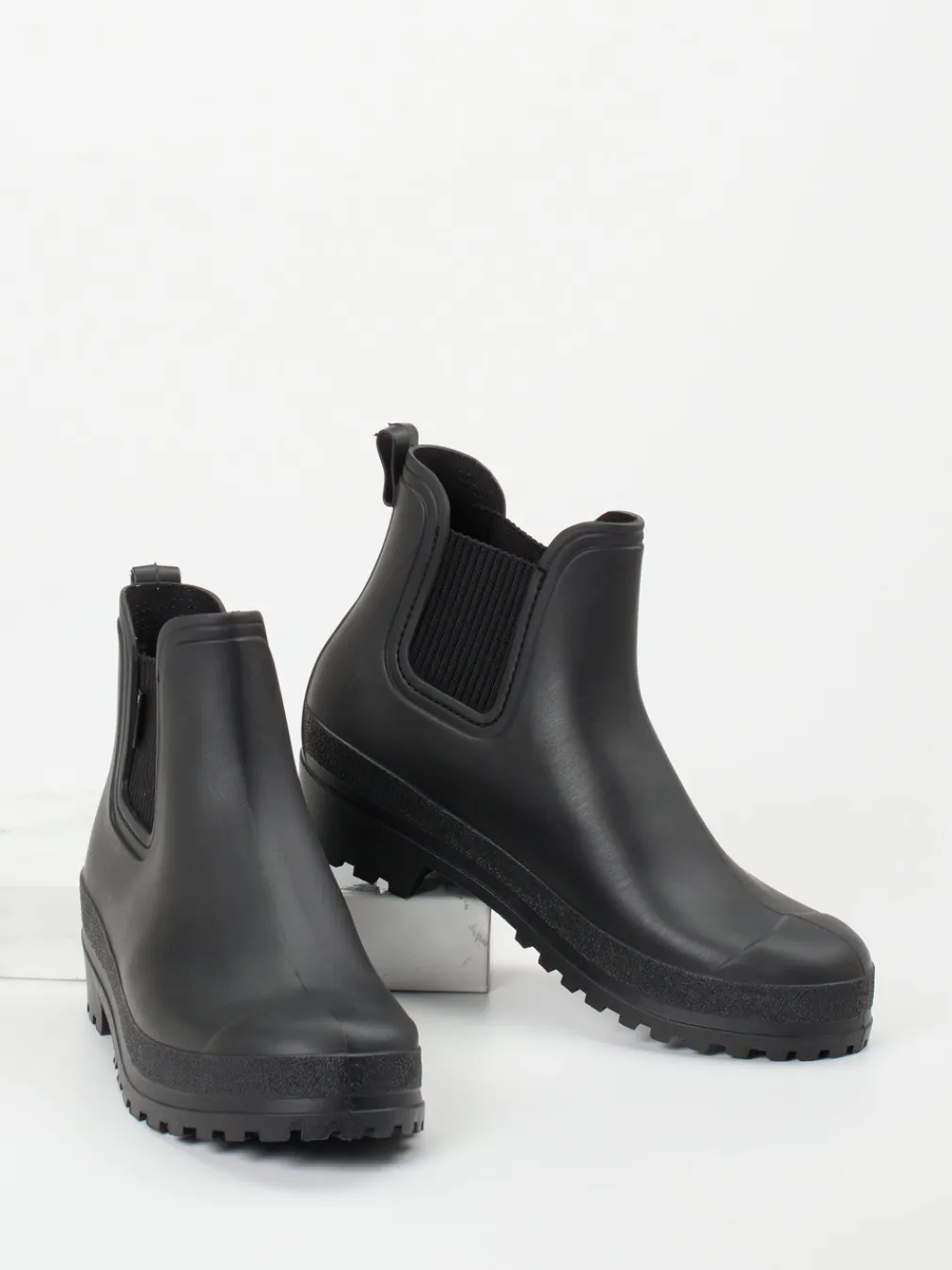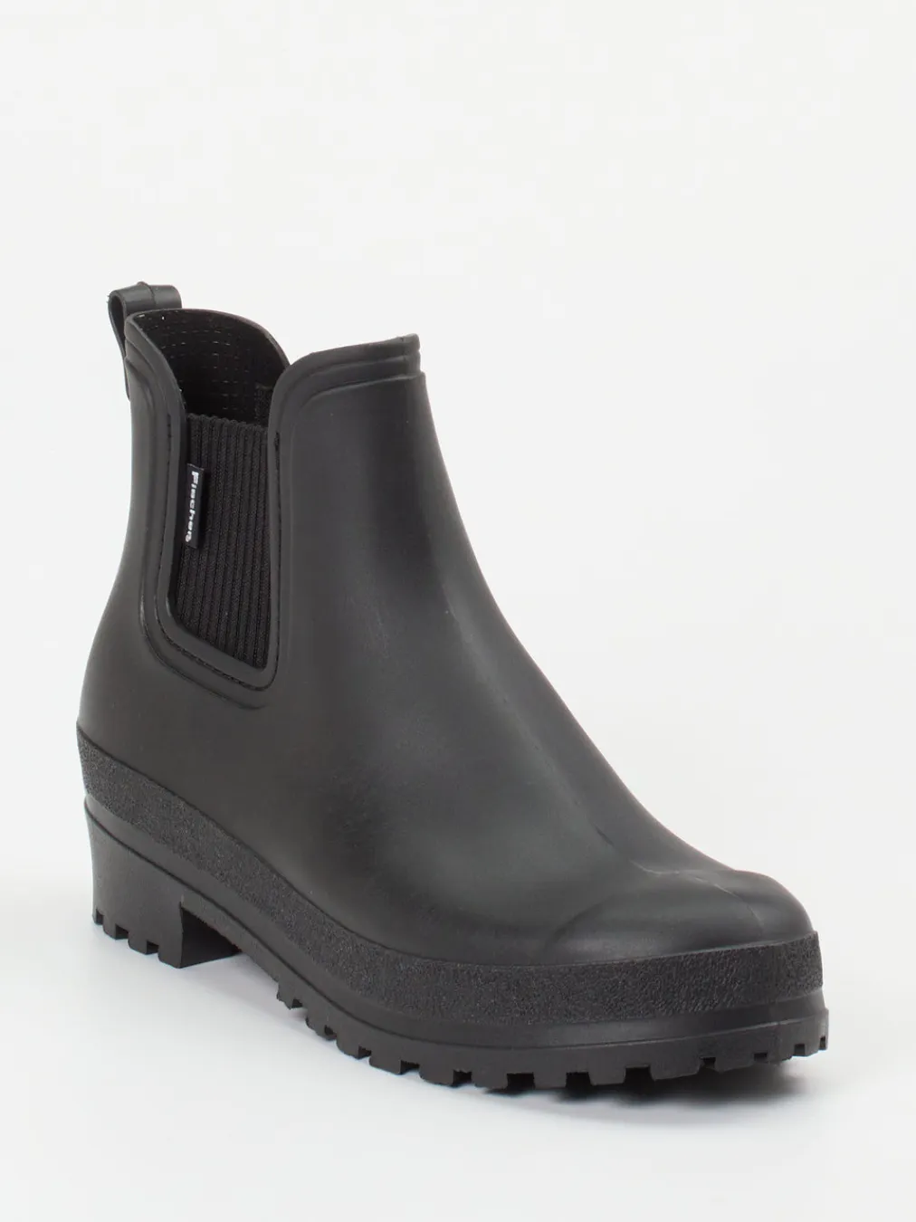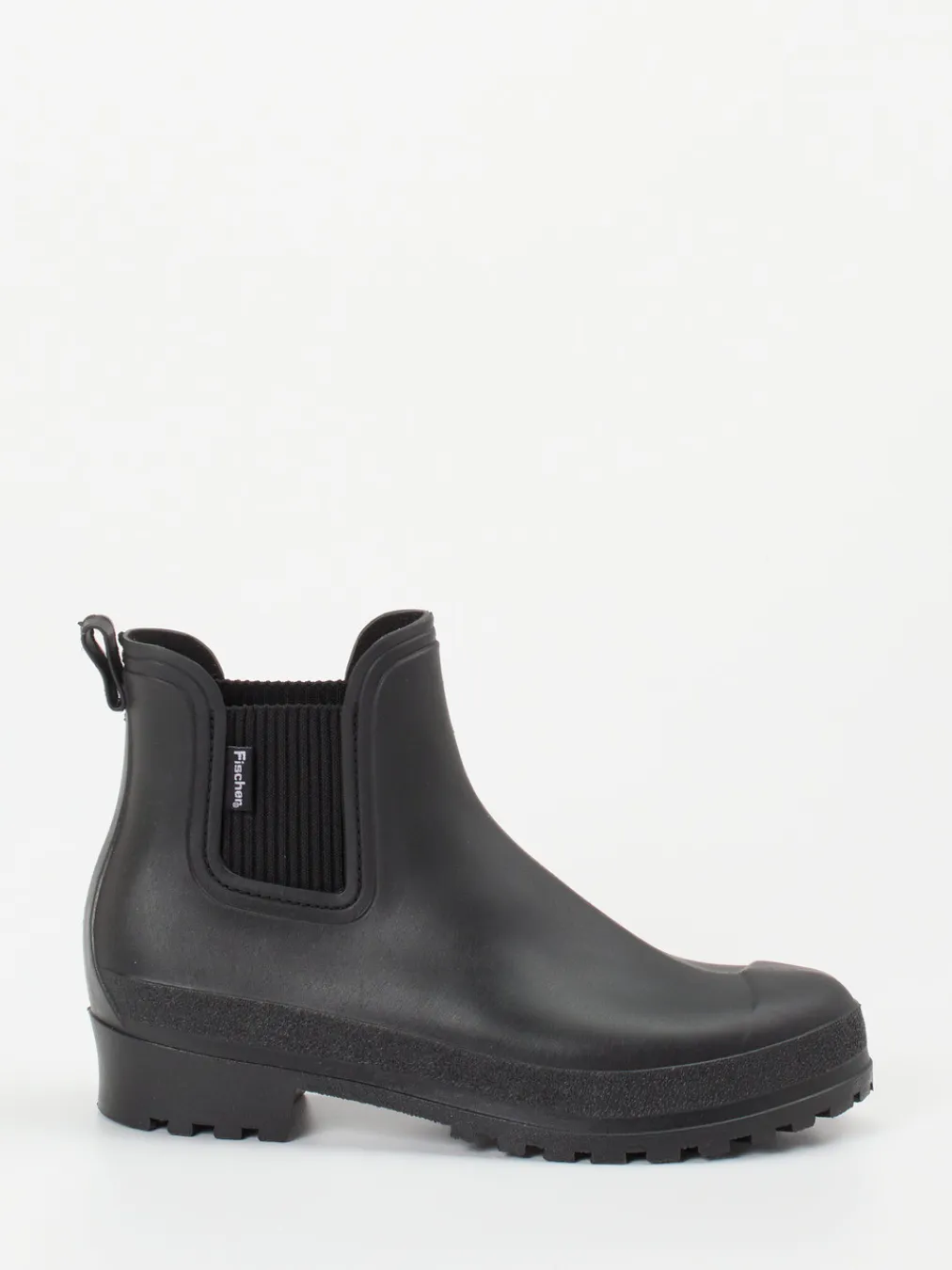 Bereit für nasse Tage.Die Marke Fischer präsentiert mit dieser Damen-Stiefelette eine schnittige Variante des klassischen Gummiboots. Ideal für regnerische Tage in Stadt und Natur vereint das Modell praktischen Nutzen mit minimalistischem Look. Die mattschwarze Optik aus wasserabweisendem Synthetikmaterial kommt mit seitlichen Ton-in-Ton Elastikeinsätzen und einer rückseitigen Zuglasche – typisch für Chelsea-Boots. Die griffig profilierte Gummisohle sorgt für Trittsicherheit, während das textile Innenfutter angenehme Wärme bietet. Das schnörkellose Design lässt sich vielseitig stylen, etwa zu Funktionsmantel oder City-Outfits im Gorpcore-Stil. Robust, stilvoll und durchdacht – wetterfeste Qualität von Fischer.