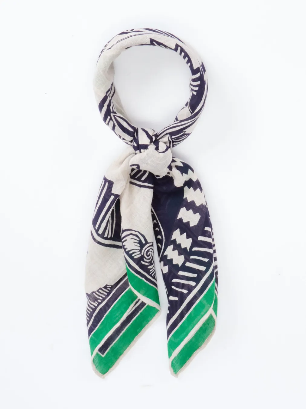 Das quadratische Halstuch vereint tropische Illustrationen mit einem luftigen Baumwollgewebe – ein Accessoire, das sommerliche Looks stilvoll akzentuiert.