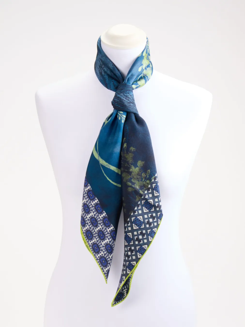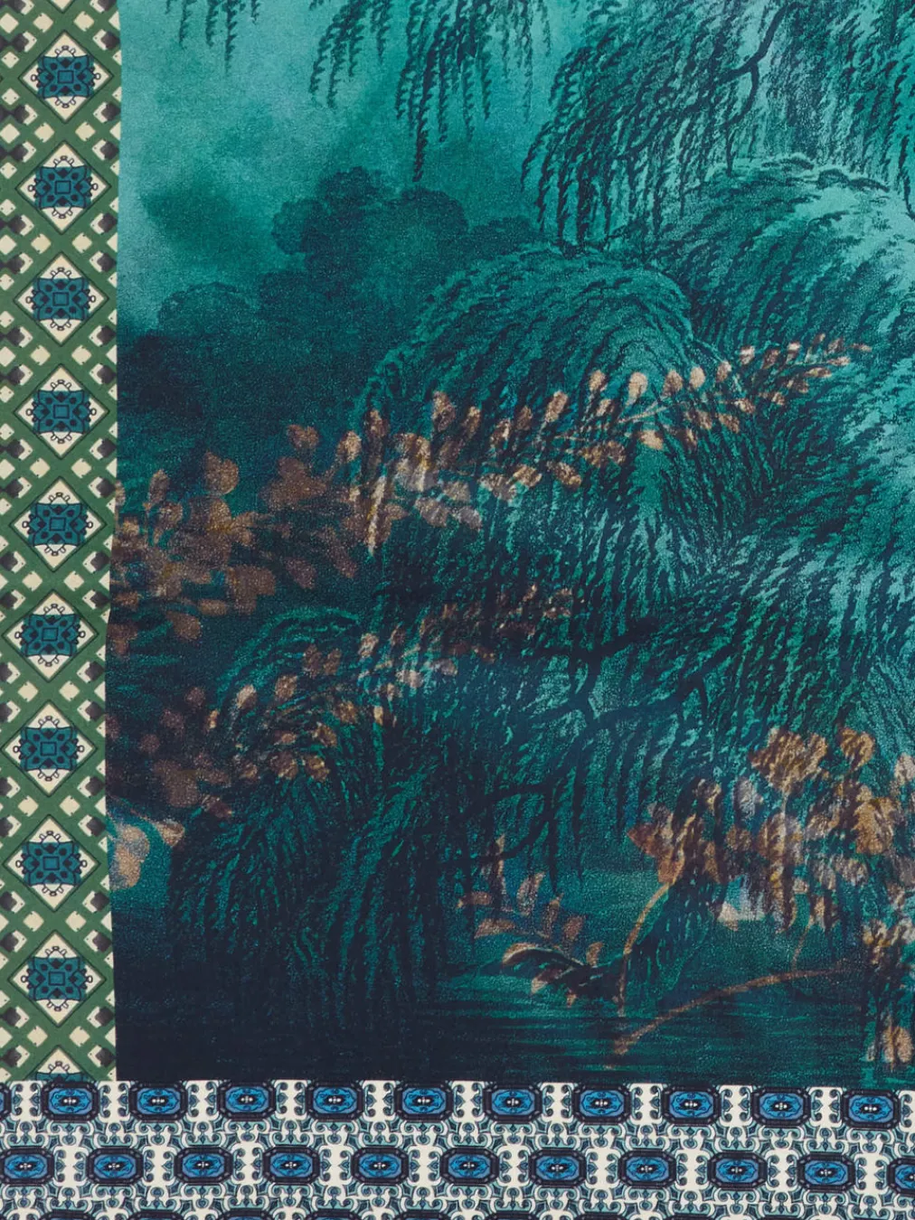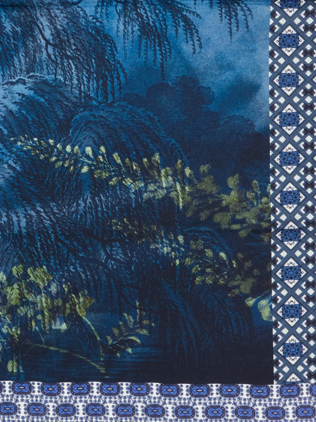 Die kunstvoll arrangierten Landschaftsmotive und die glänzende Oberfläche verleihen diesem Seidentuch einen ausdrucksstarken Charakter mit luxuriösem Flair.