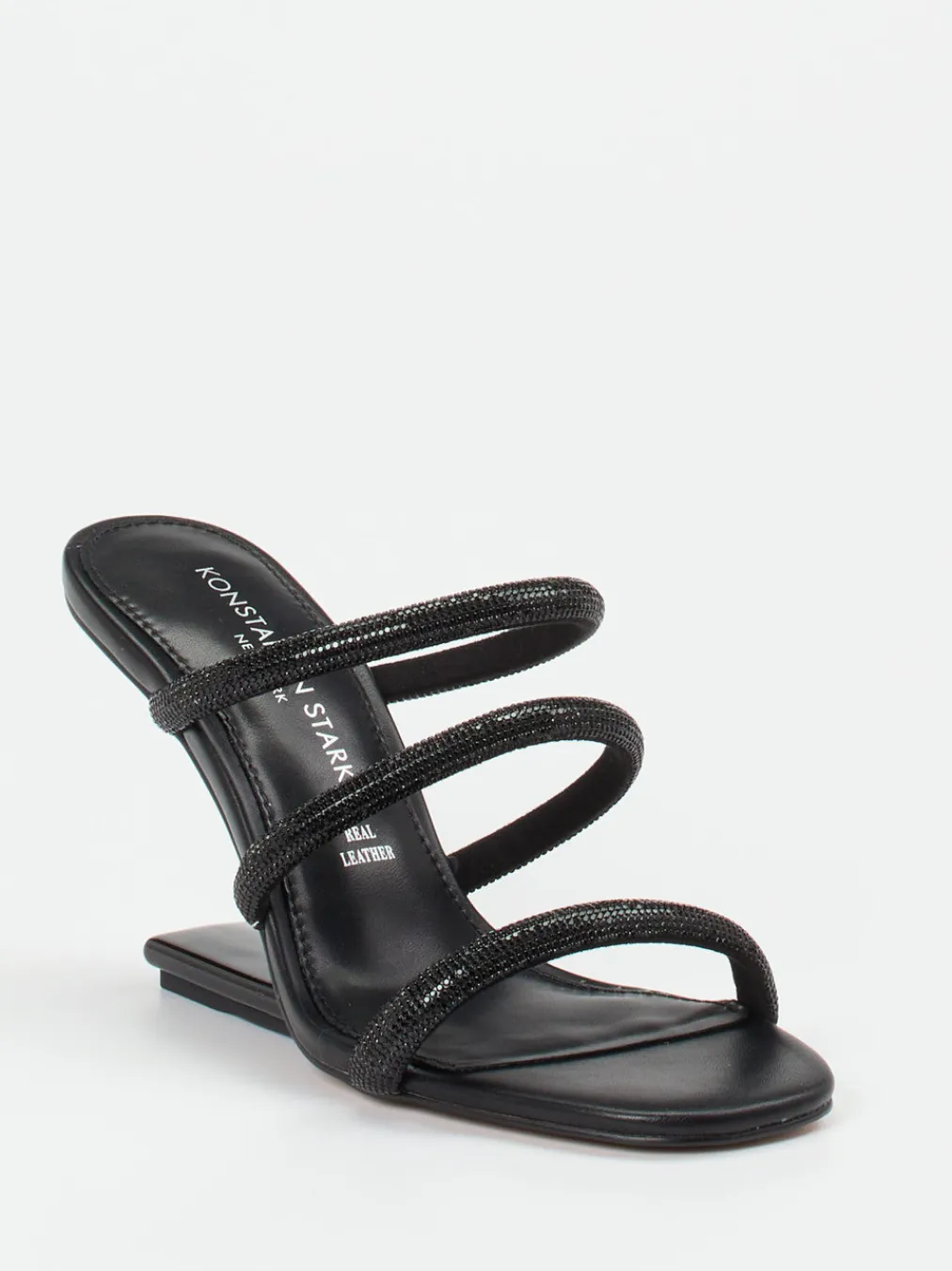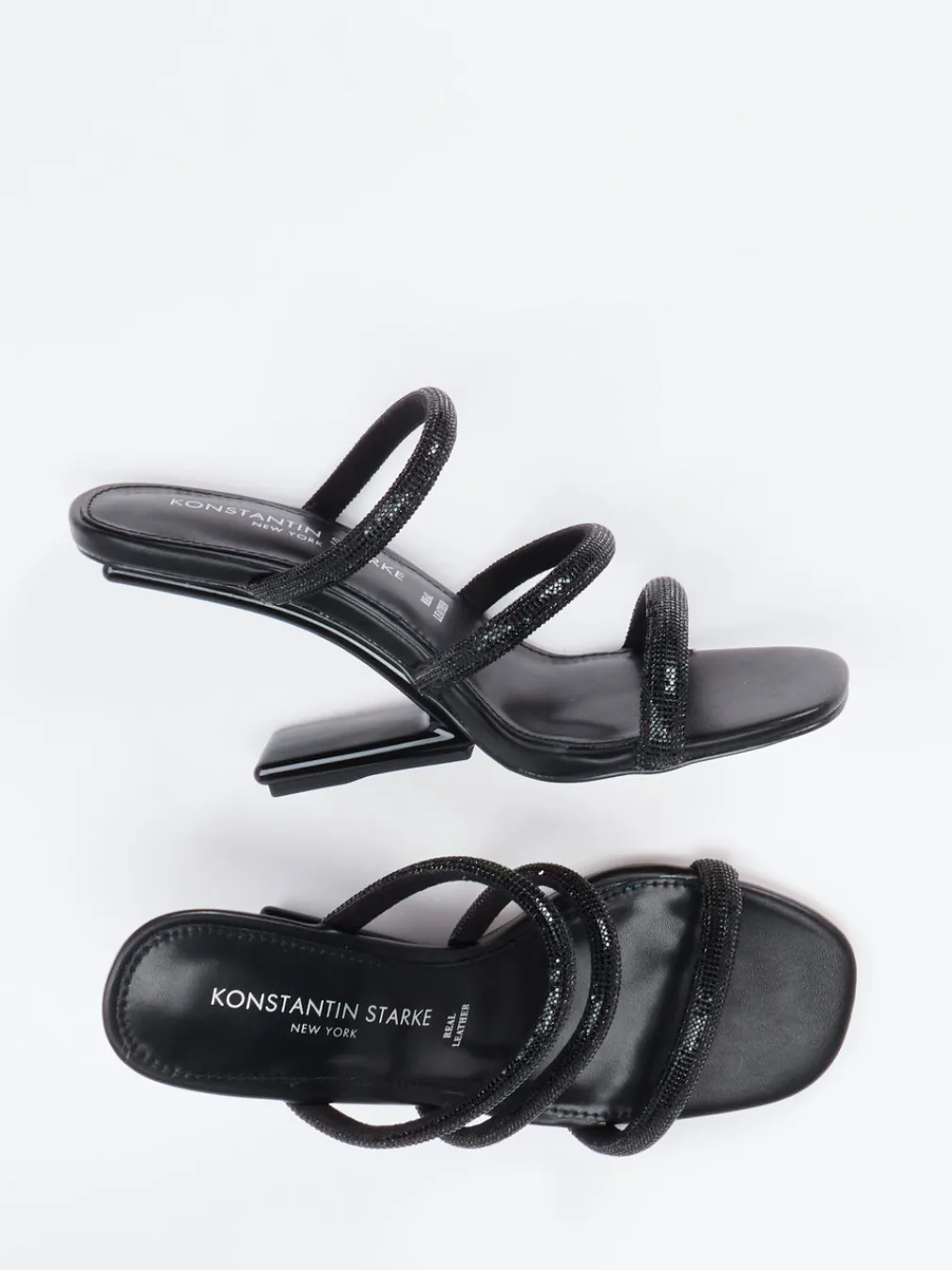Extravaganz in stilvoller Silhouette.Konstantin Starke präsentiert mit dieser Sandalette ein modisches Highlight der Saison. Für einen großen Auftritt am Abend bietet sich dieser Mule mit schwarzen Metallicleder-Riemen an. Die vier asymmetrisch angeordneten Riemen schimmern glitzernd und kontrastieren stilvoll zum glänzend lackierten, skulptural geformten Absatz. Offen designt, setzt die elegante Linienführung moderne Akzente im Sinne aktueller Trends wie „Sculptural Heels“ und „Black Shine“. Ideal für formelle Anlässe mit modischem Anspruch – von der Gala bis zur Cocktailparty. Kombiniert mit Metallic-Accessoires entsteht ein harmonisch abgestimmter Look. Modebewusste Ästhetik trifft bei Konstantin Starke auf trendsetzende Formenvielfalt.