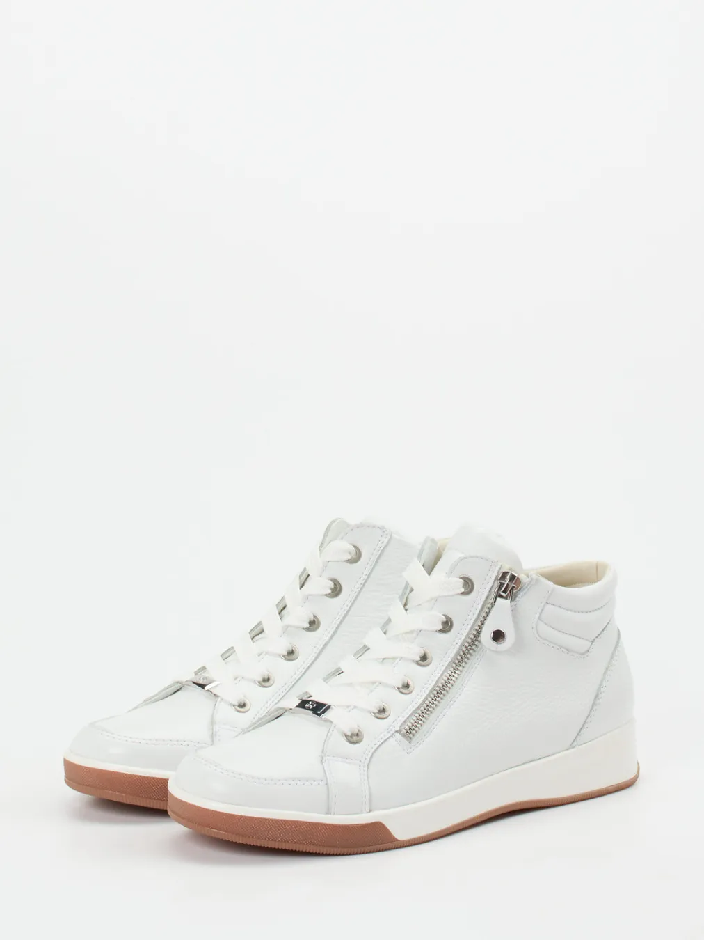 Softness trifft auf sportive Linien.Dieser High-Top-Sneaker von Ara vereint Komfort und cleane Ästhetik auf zeitgemäße Weise. Für entspannte Tage auf den Beinen sorgt das hochwertige, genarbte Kalbleder in Offwhite. Der knöchelhohe Schnitt garantiert Stabilität, während sich durch die Kombination aus Schnürung und silbernem Reißverschluss ein unkompliziertes An- und Ausziehen ergibt. Eine hellbraune Gummisohle mit strukturierter Profilierung sorgt für Trittsicherheit. Polsterung am Einstieg, weiches Frottee-Futter und ein herausnehmbares Fußbett bieten ein angenehmes Tragegefühl. Trendig im Streetwear-Kontext inszenierbar, besonders stilvoll zu Jogpants oder weißer Crossbody-Bag. Ara vereint gekonnt Alltagstauglichkeit mit durchdachtem Komfortdesign.