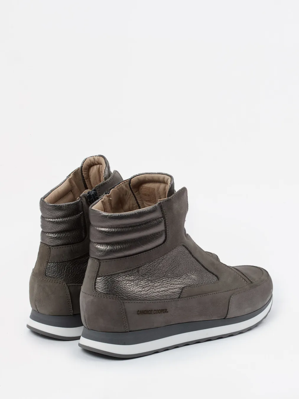 Komfort und ein sportives Design vereinen sich in diesem Sneaker high der Marke Candice Cooper. Das steingraue Nubukleder ist wunderbar weich und wird durch tonige Steppnähte lebhaft akzentuiert. In der Kombination dazu harmoniert das anthrazitfarbene Metallicleder in dezenter Craquelé-Optik. Einen schönen Kontrast bildet die grau-weiße Gummisohle, die gelungen die sportliche Aussage unterstreicht. Während der dezente Innenreißverschluss den Ein- und Ausstieg erleichtert, bietet die gepolsterte, herausnehmbare Innensohle mit dem Dry-Go- Effekt ein angenehmes Tragegefühl.