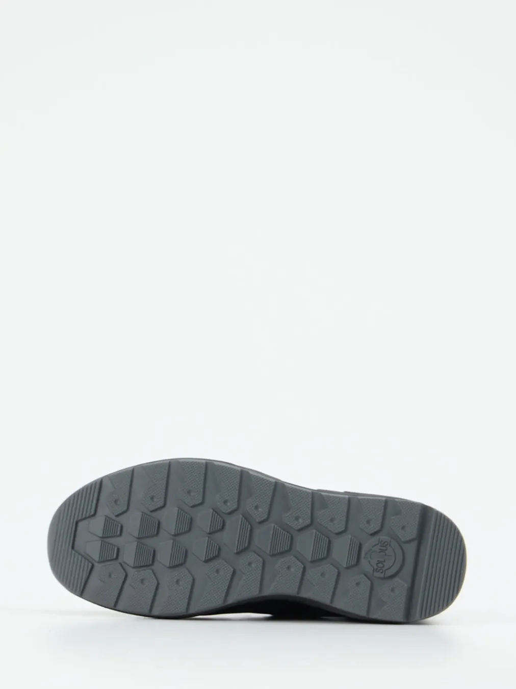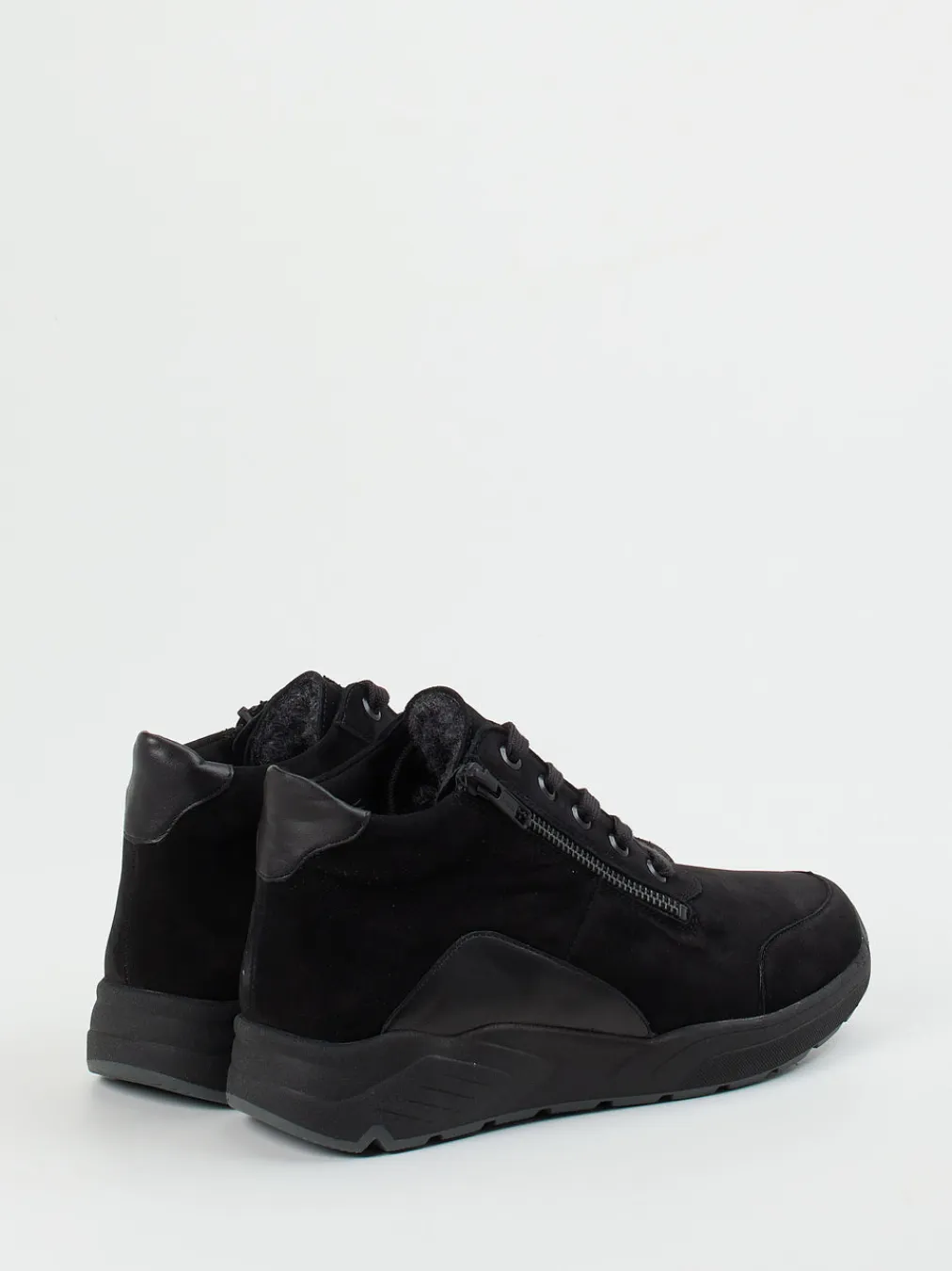 Komfort trifft sportives Understatement.Solidus präsentiert mit dieser schnürbaren Stiefelette aus der Linie Kea einen High-Top Sneaker für Damen. Bei kühlen Temperaturen sorgt das weiche Wollfutter für angenehme Wärme. Schwarzes Nubukleder, samtig angeschliffen, trifft auf dezente Glattleder-Akzente in der robusten Fersenpartie. Die sportlich-voluminöse, knöchelhohe Silhouette mit seitlichem Zipper und gepolstertem Schaft bietet optimalen Komfort. Eine griffig profilierte Gummisohle gewährleistet Trittsicherheit, während das ergonomisch geformte Wechselfußbett aus Kork für individuellen Laufkomfort sorgt. Der Look fügt sich stimmig in minimalistische All-Black-Outfits – etwa kombiniert mit Thermo-Leggings und Steppjacke. Solidus verbindet passgenauen Sitz mit durchdachter Funktion für moderne Wintermomente.
