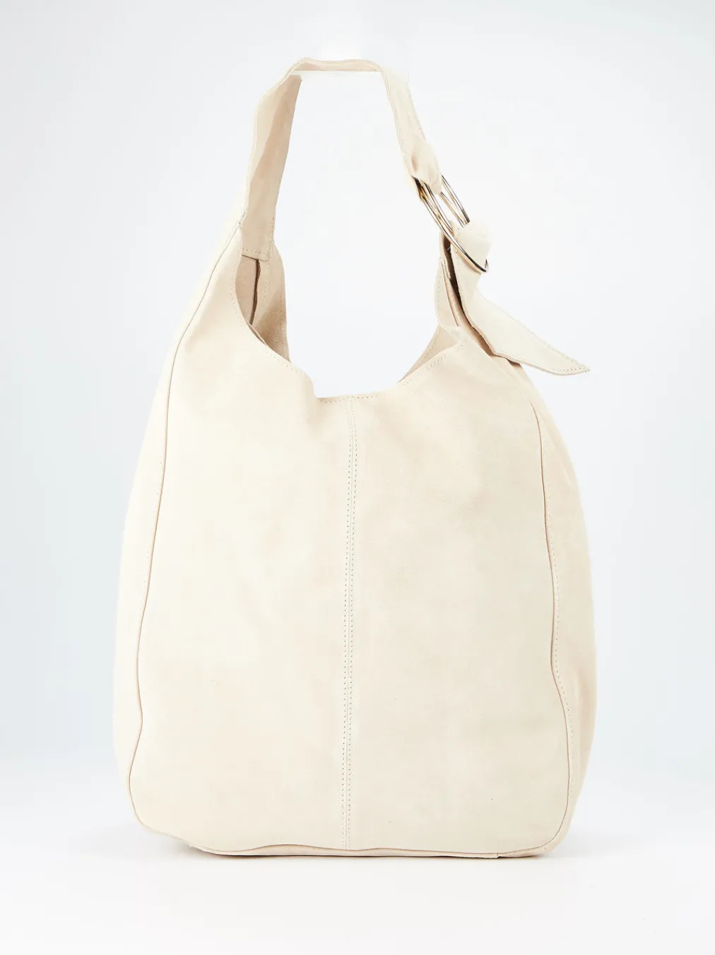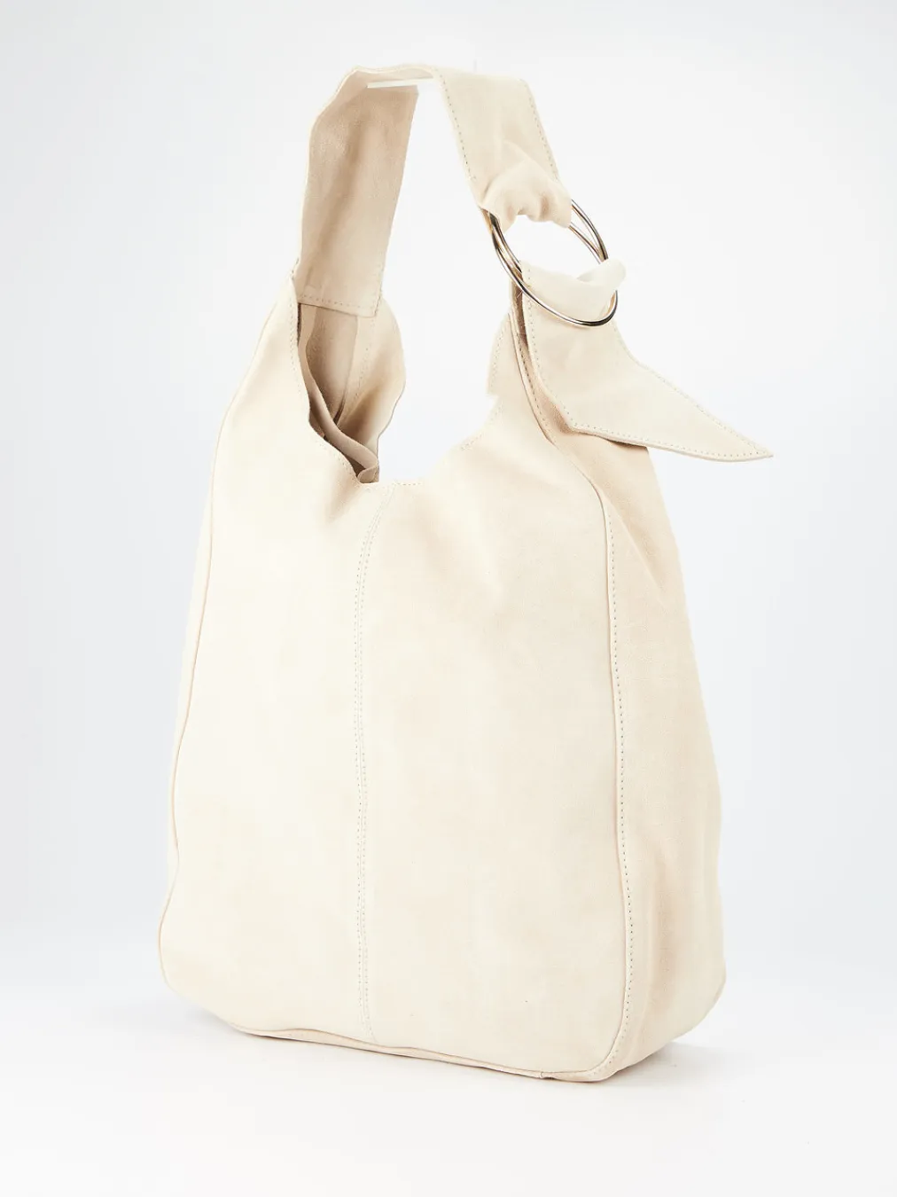 Cremig-beiger Velours trifft auf minimalistisches Design und goldene Akzente – diese Hobo Bag verbindet Soft-Luxury mit modernen Formen.