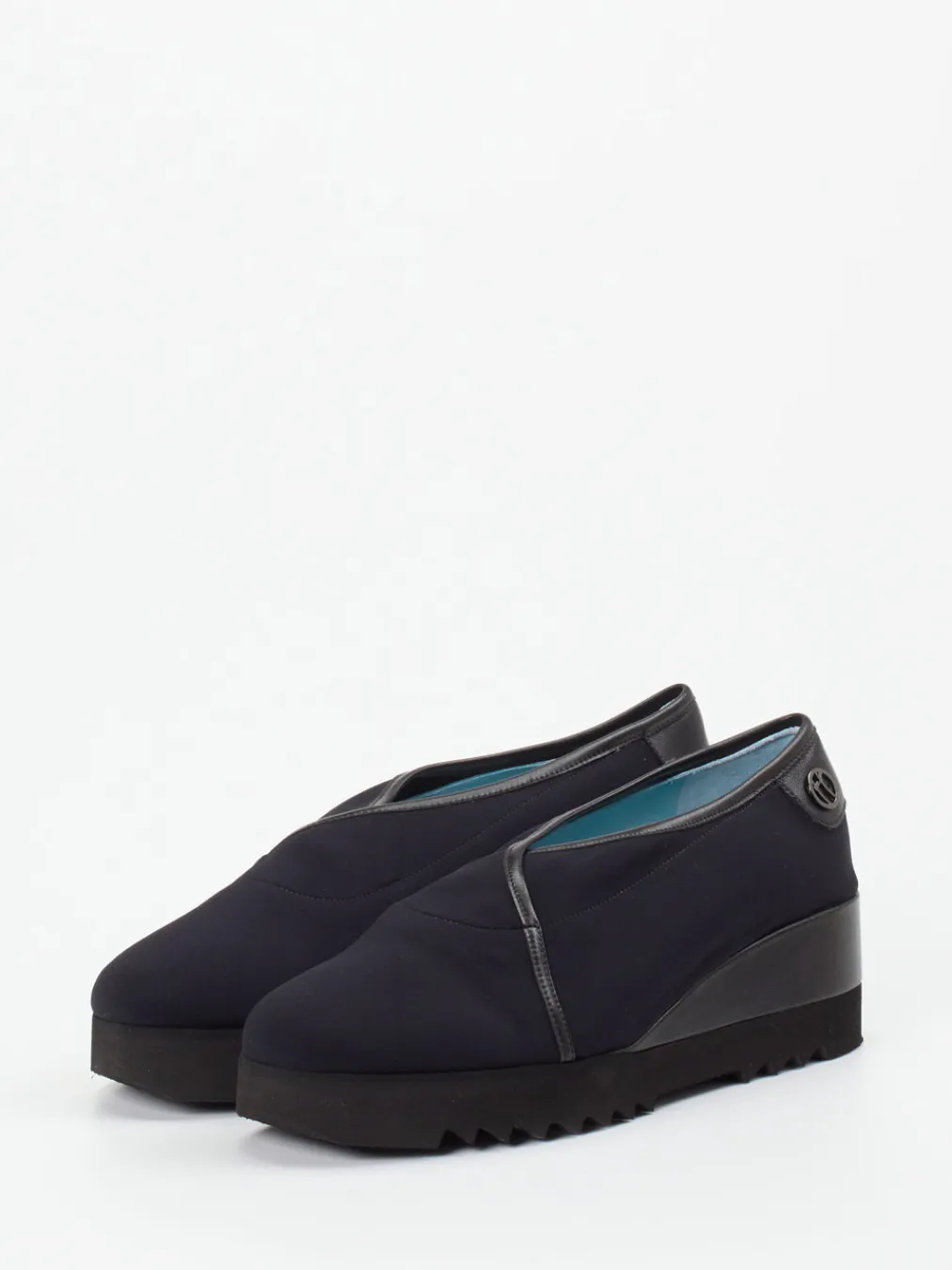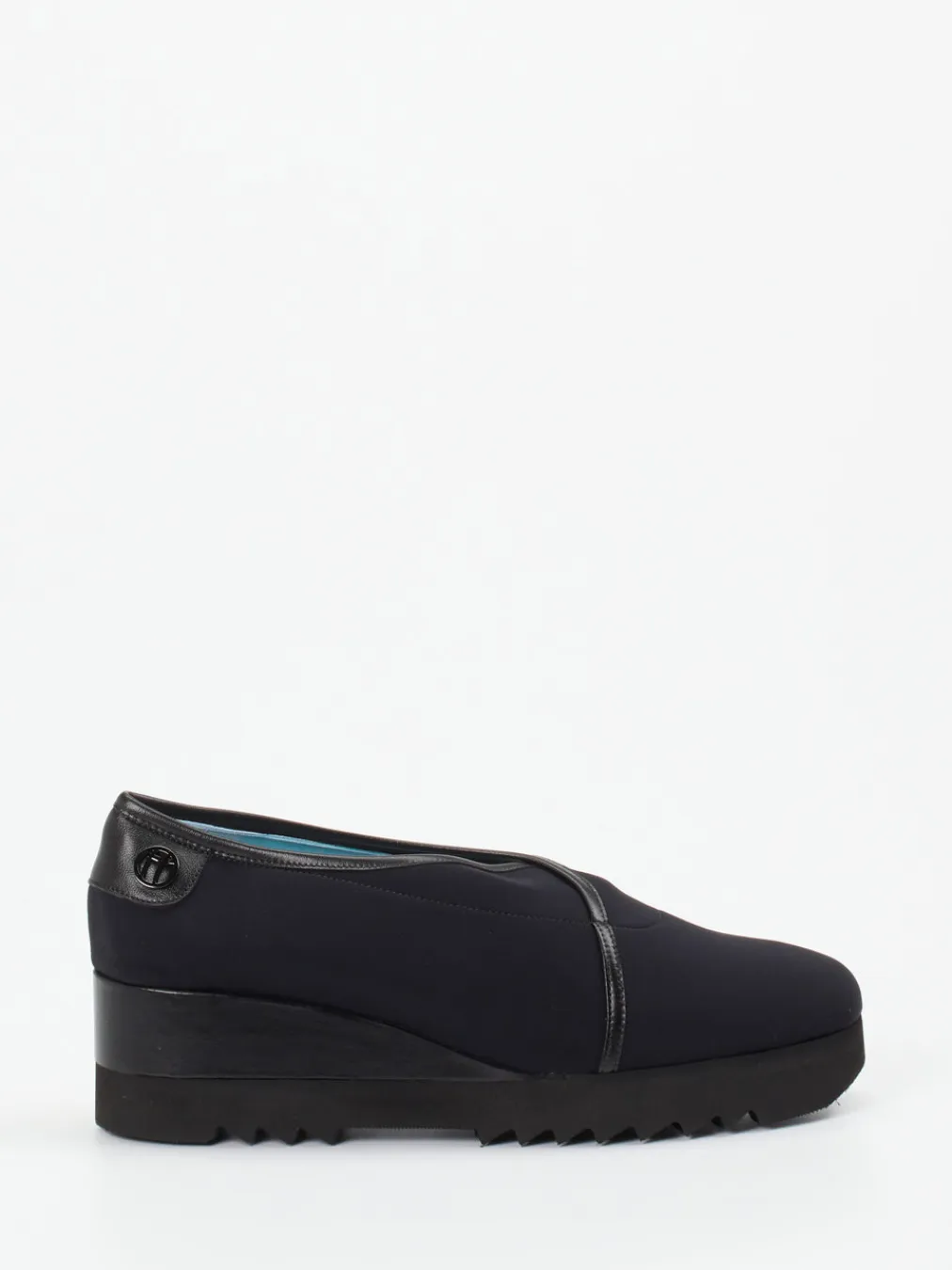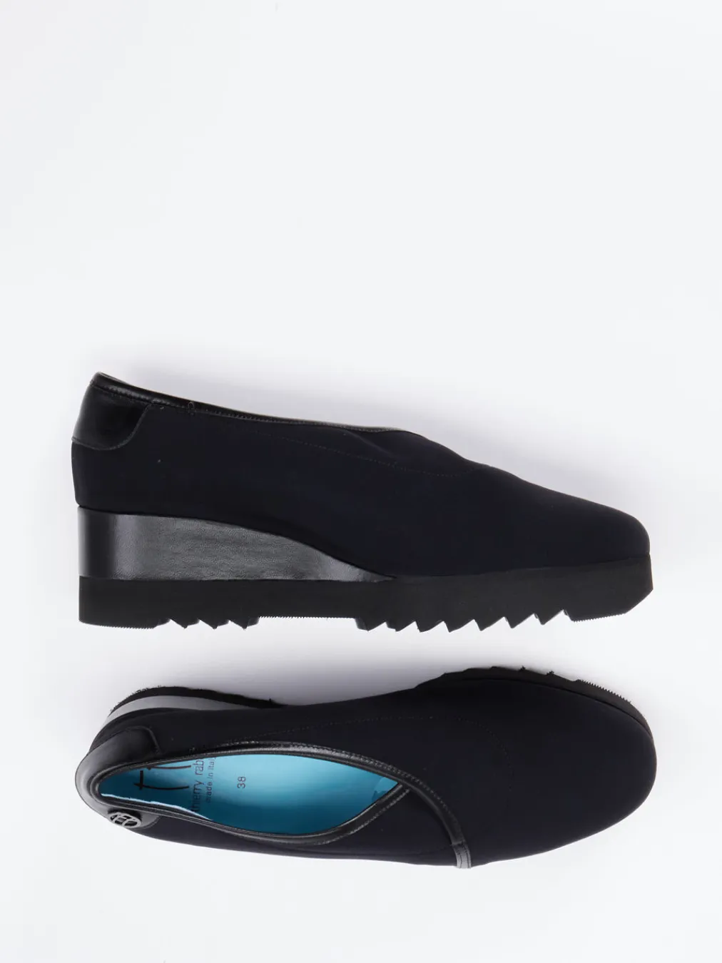 Understatement mit Profil.Thierry Rabotin steht für durchdachtes Schuhdesign – so wie bei diesen stilvollen Damen-Keilpumps. Ob im Büro oder bei urbanen Erledigungen: Das tiefschwarze Textilmaterial mit matter Oberfläche wirkt klar und wertig. Der Keilabsatz mit 5 cm Höhe und markanter Zahnprofilsohle sorgt für komfortable Stabilität. Ton-in-Ton-Paspelierung und ein dezentes Logo-Detail am Fersenbereich unterstreichen den minimalistischen Look. Das türkisfarbene Innenfutter aus Lammnappa setzt einen feinen Akzent. Modisch sind diese Pumps inspiriert von Quiet Luxury und Streetwear. Zeitlos-modern mit typischer Thierry-Rabotin-Leichtfüßigkeit.