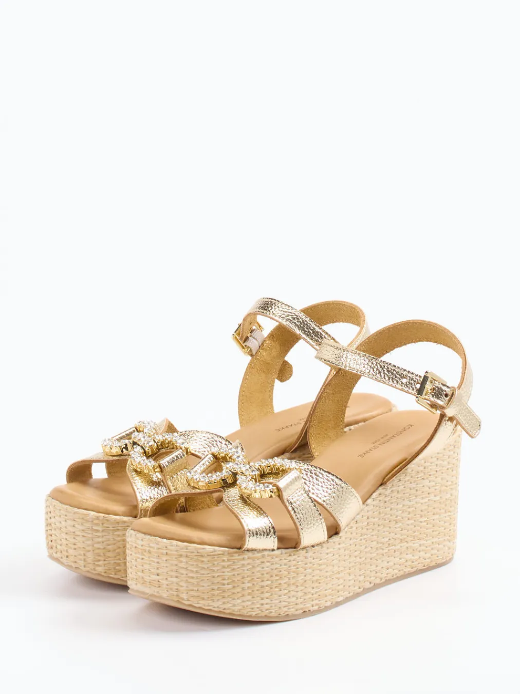 Strassverzierter Sommerschuh mit mediterranem Flair und moderner Plateau-Silhouette – ideal für trendbewusste Looks an warmen Tagen.