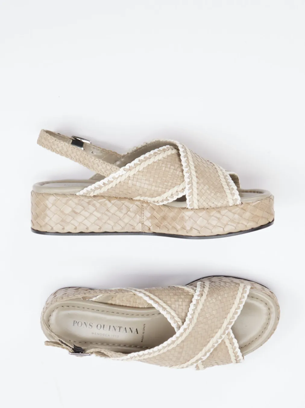 Ideal für Urlaubsflair und entspannte Alltagssituationen verbindet dieses Modell beiges Flechtleder mit einer markanten, weißen Kontrastpaspelierung. Die gekreuzten, matt strukturierten Riemen und der individuell verstellbare Fersenriemen mit Metallschnalle formen eine offene, plateauartige Silhouette. Eine leichtgewichtige Gummisohle mit integriertem Keil sorgt für Tragekomfort – rutschhemmend und alltagstauglich. Inspiriert von Boho-Elementen und mediterranen Trends passt sie besonders schön zu Naturmaterialien wie Leinen oder Bast.