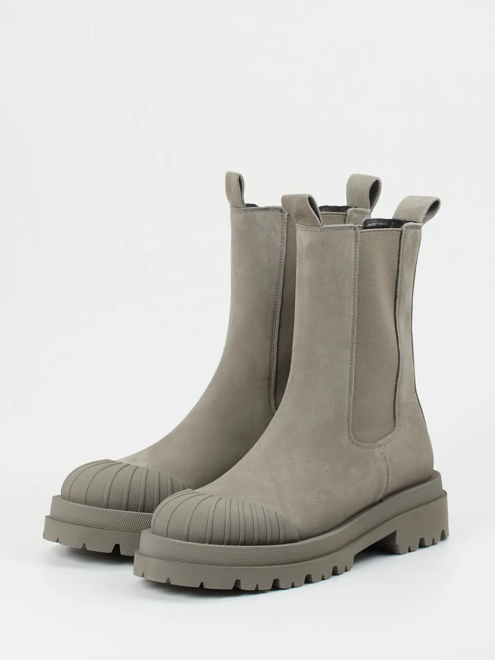Utility trifft Stilbewusstsein.Kennel & Schmenger interpretiert mit diesen Chelsea Boots klassische Minimalistik neu. Für wechselhafte Herbsttage und urbane Wege geschaffen, überzeugt das Modell mit robustem Nubukleder, samtig angeschliffen, in einem eleganten Taupe-Ton. Die strukturierte Gummikappe, tonige Elastikeinsätze und das markante Sohlenprofil setzen charakteristische Akzente. Die knöchelhohe Silhouette mit zwei Zuglaschen erleichtert den Einstieg, während das Innenfutter aus Ziegenleder für hohen Tragekomfort sorgt. Inspiriert vom Streetwear-Stil und Chunky-Trend sind sie ideal für entspannte Outdoor-Styles. Prima kombinierbar mit Steppjacken oder Strick. Komfort und Designexpertise – typisch Kennel & Schmenger.