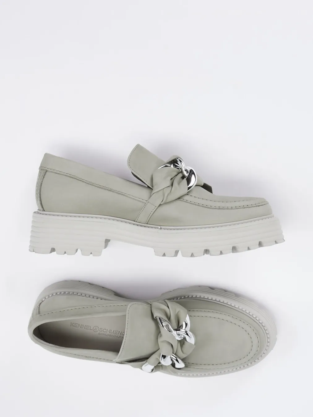 Dieser Statement-Loafer kombiniert hochwertiges Nubukleder mit markanter Chunky-Sohle und silberner Kette – perfekt für stilbewusste Alltags- und Office-Looks.
