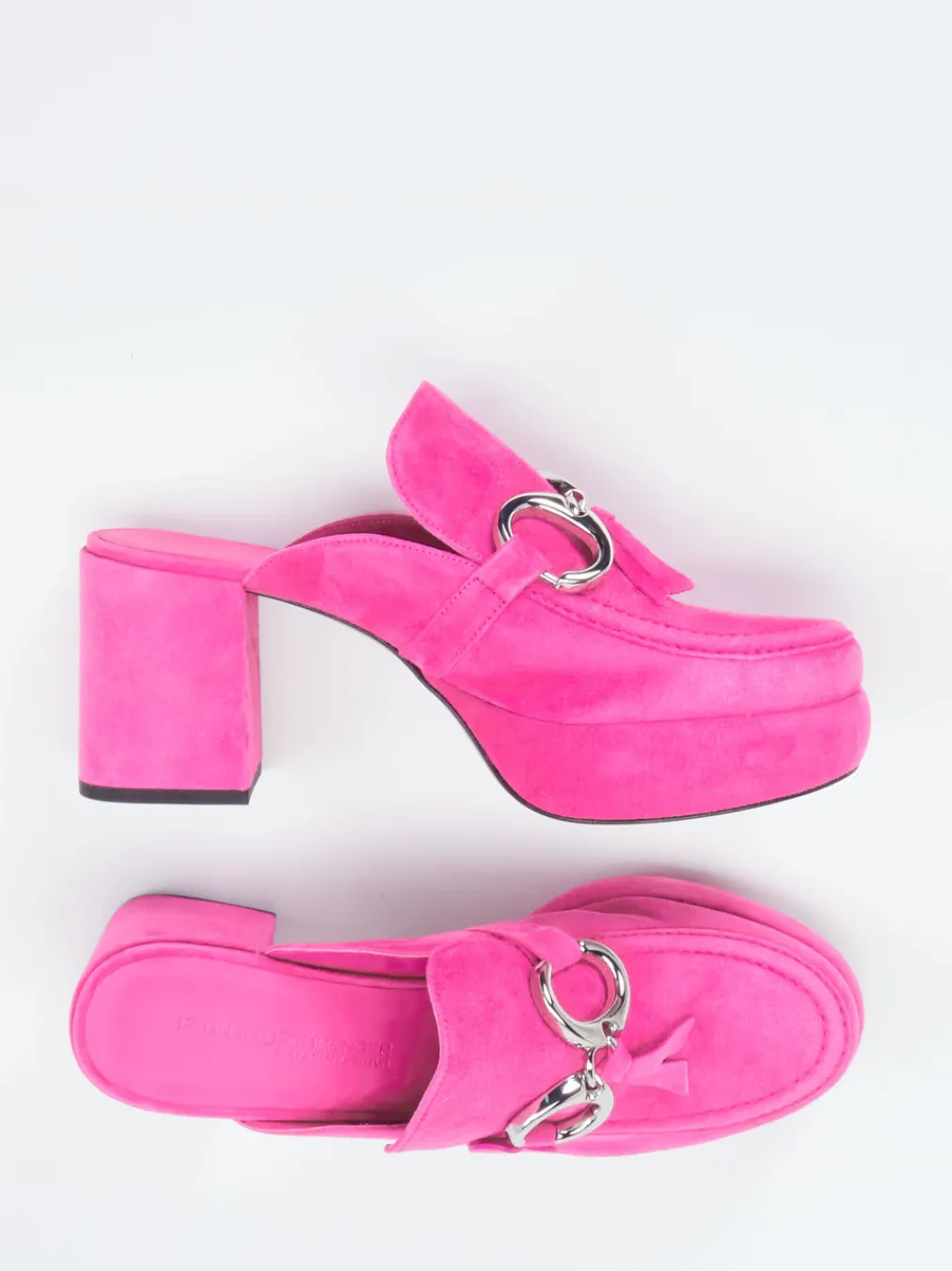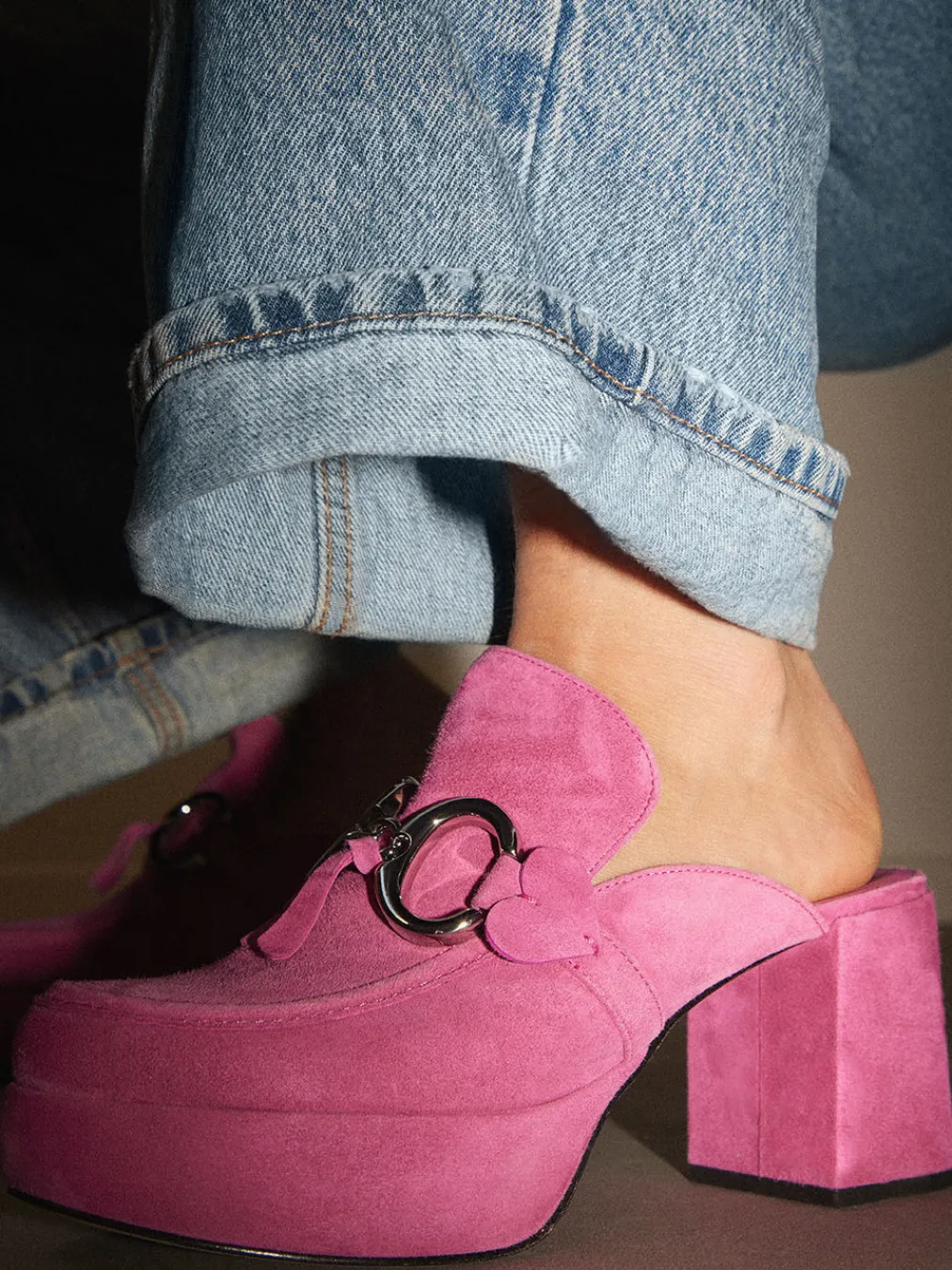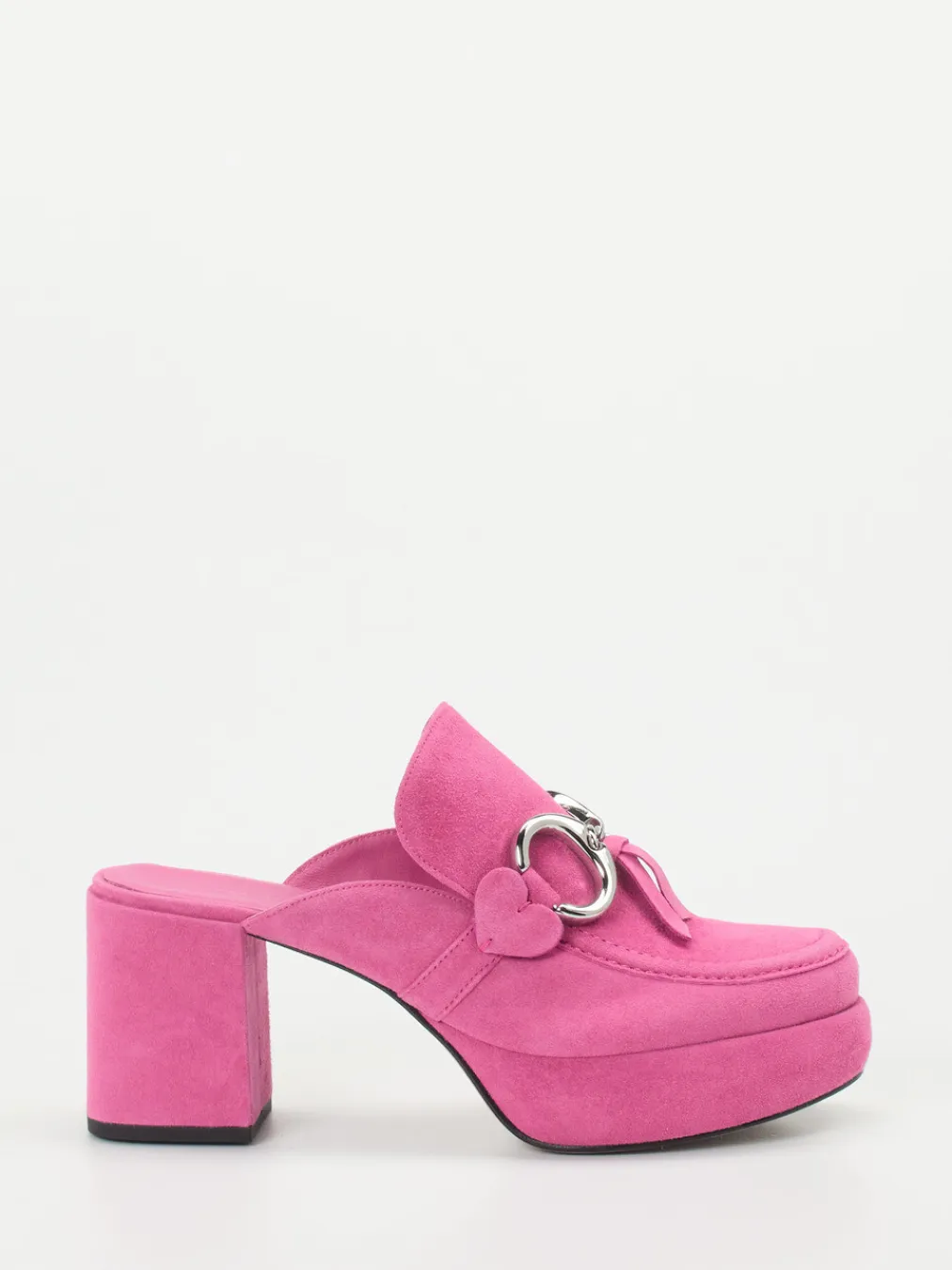 Ob zur Party oder auf der Straße – der hochmodische Look überzeugt auf ganzer Linie. Gefertigt aus pinkem Veloursleder mit samtig-matter Oberfläche und betonten Kanten trifft Retro auf Ausdrucksstärke. Die silberfarbene Schnalle mit herzförmiger Applikation und Quaste setzt verspielte Akzente im Y2K-Stil. Die lederbezogene Plateausohle mit Blockabsatz bietet sicheren Stand, während das Ziegenlederfutter und die profilierte Ledersohle für Komfort sorgen. Ideal kombinierbar mit Wide-Leg-Jeans oder Metallic-Accessoires.