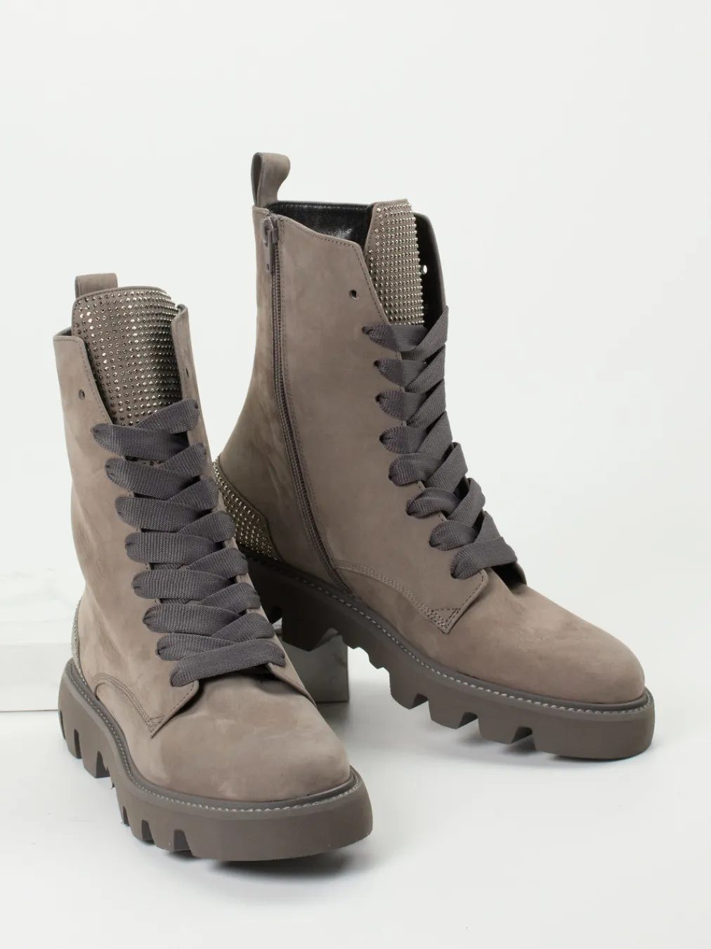 Die robuste Schnürstiefelette überzeugt mit samtigem Nubukleder und detailverliebtem Nietenbesatz – ein stilsicheres Statement zwischen Utility-Trend und urbaner Eleganz.