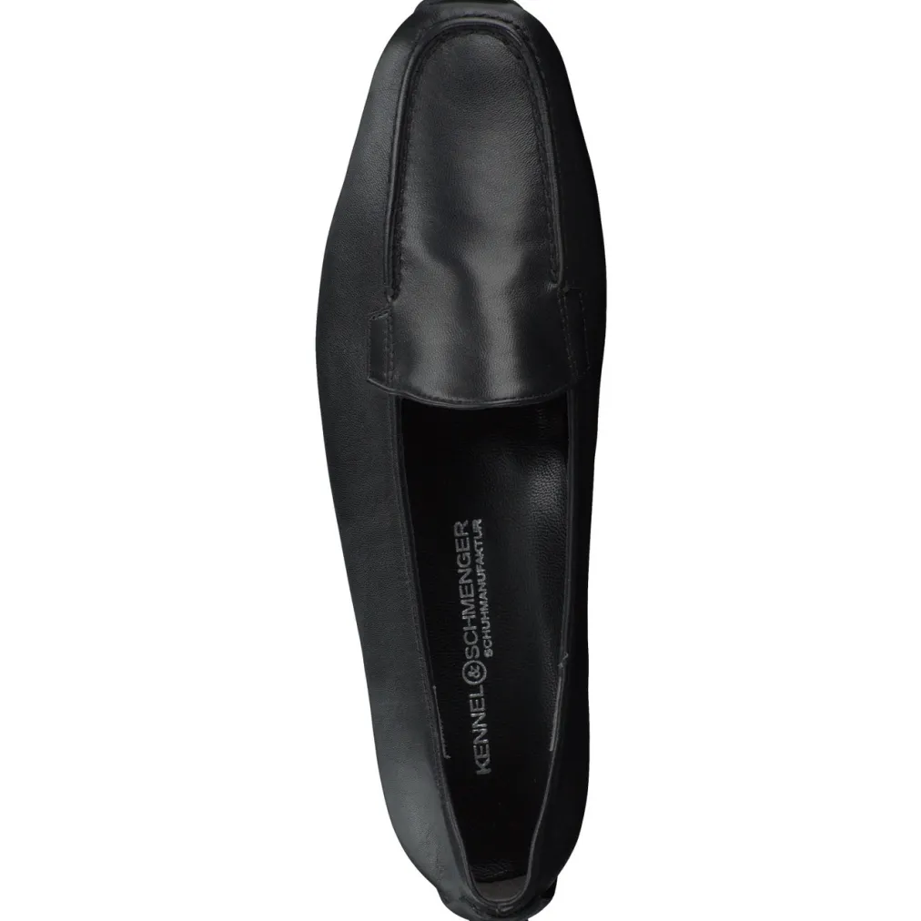 Schon fast ein Klassiker ist dieser Slipper der Firma Kennel & Schmenger. Auf der Carréform wirkt der schlichte Mokassin in dem weichen, schwarzen Nappaleder sehr hochwertig. Das Leder hat einen schönen Glanz. Die schwarze, genoppte Gummisohle ist im Stil der Autofahrersohlen an der Ferse hochgezogen. Dieses Detail vermittelt die notwendige Sportlichkeit und gibt einen Hinweis auf die Bequemlichkeit dieses Slippers.